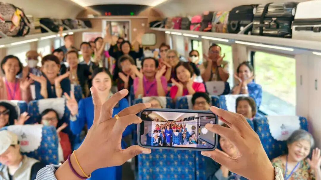游客乘坐中老铁路国际旅客列车跨境旅行。国铁昆明局供图