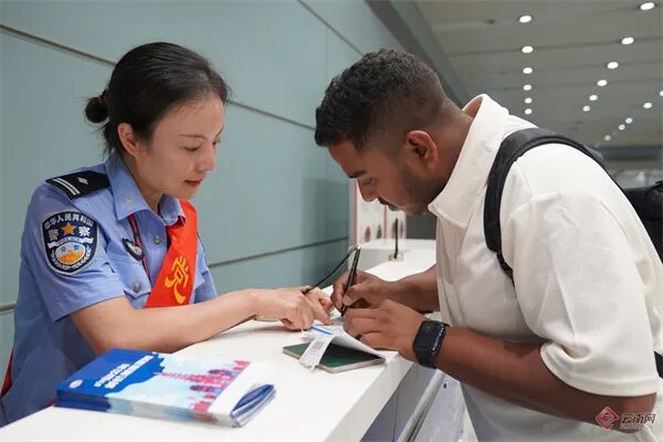 民警为享受免签政策的旅客办理免签入境。图源:云南网