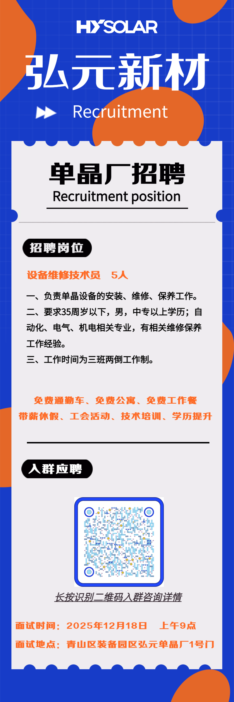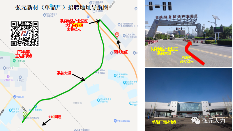 面试地址:青山区装备产业园区弘元新材单晶厂1号门 弘元新材料(包头)有限公司-招聘接待处(扫码用"高德地图”导航直达)。