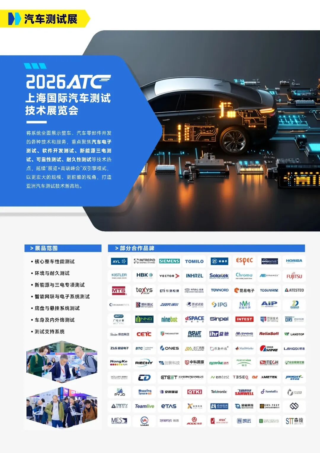 2026ATC汽车测试展将系统将全面展示整车、汽车零部件开发的各种技术和服务,重点聚焦汽车电子测试、软件开发测试、新能源三电测试、可靠性测试、耐久性测试等技术热点,延续“展览+高端峰会”双引擎模式,展会预计汇聚300余家汽车测试全产业链企业参展,配套举办6大技术峰会,邀请150余位行业领袖深度分享,探讨150多项行业及技术热点话题,吸引2,000余名技术嘉宾及20,000余名专业观众共赴盛会。