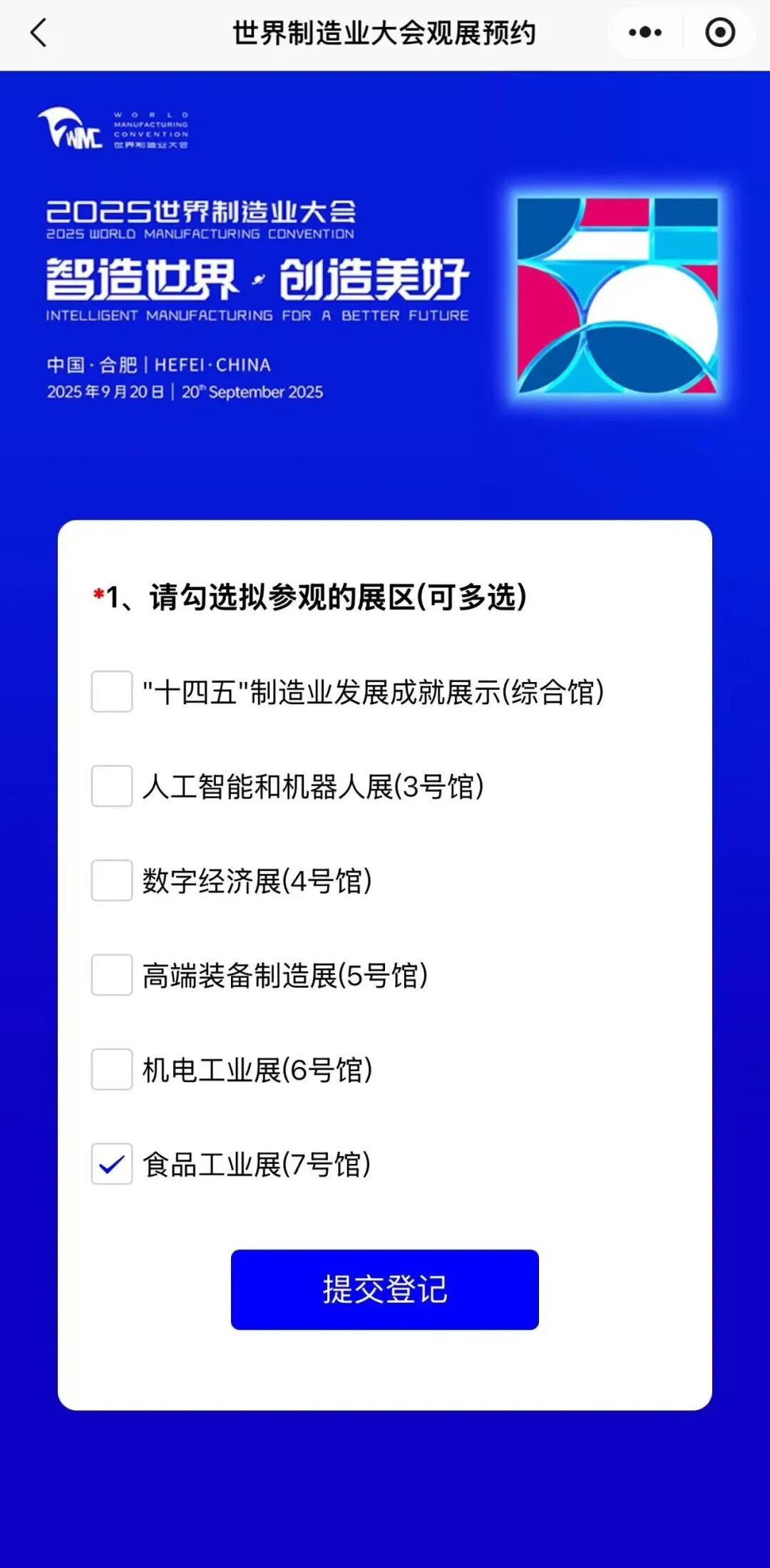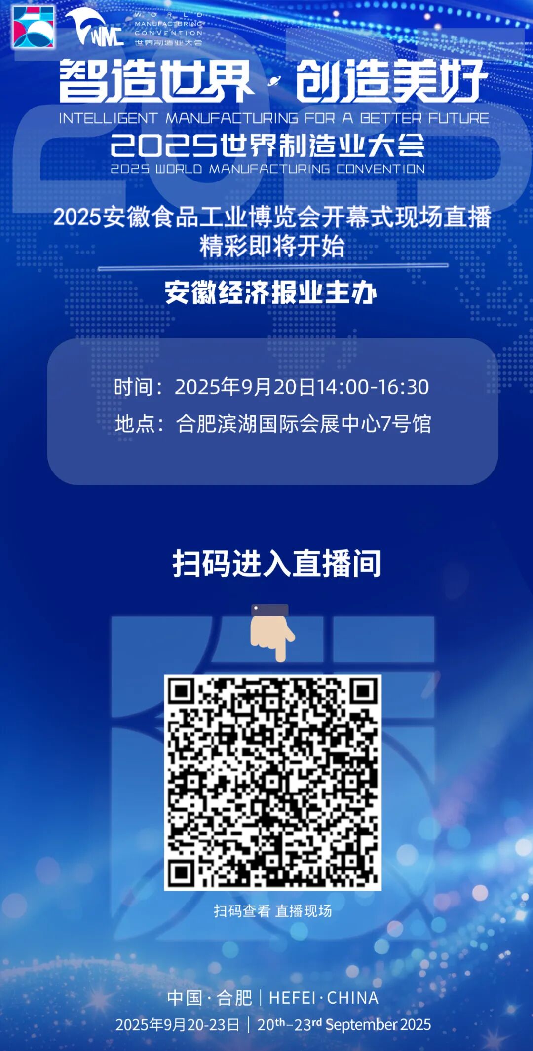 9月20日下午2025食品工业博览会将在合肥启幕!一、时间地点时间:2025年9月20日14:00地点:合肥滨湖国际会展中心(合肥市包河区锦绣大道3899号)7号馆。二、直播观看方式1.点击左下角“阅读原文”观看直播。2.扫描上方二维码观看直播。三、应邀参会进场流程使用世界制造业大会微信小程序登记预约,凭二维码至闸机处核验入场参观。长按识别二维码,关注我们来源 / 安徽经济报 安徽经济网编辑 / 窦振鑫 校对 / 叶静 审核 / 栗亮