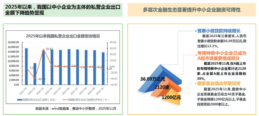 2025年全球经贸摩擦再次升温,中国贸促会数据显示,9月全球经贸摩擦综合指数为106,19个国家(地区)涉华经贸摩擦指数为115,持续处于高位。对于深度嵌入全球分工的中小企业而言,出海阻力加大,增速放缓。Wind数据显示,2025年以来,我国以中小企业为主体的私营企业出口金额下降趋势显现,当月环比从3月份的58.83%,波动下降至10月份的-6.18%。