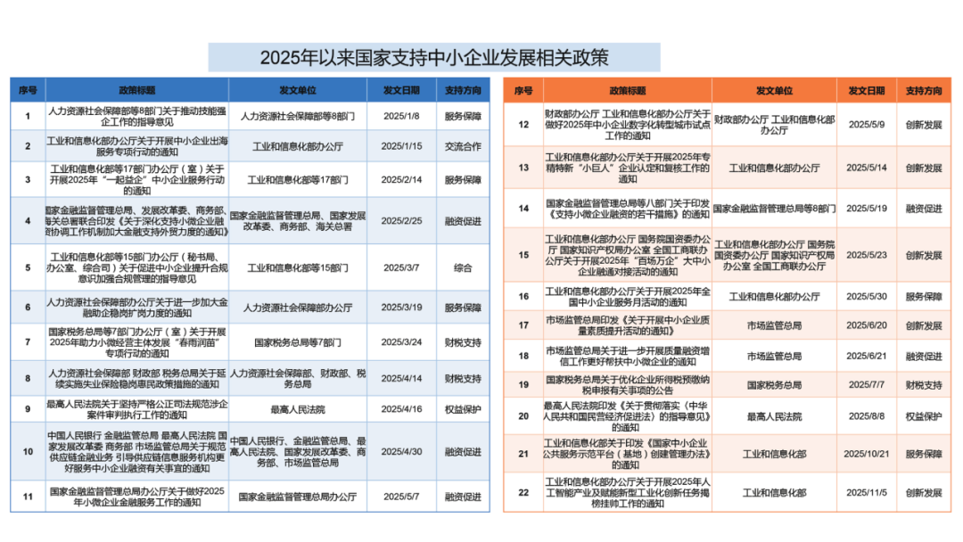 2025年我国中小企业融资支持效能日益凸显。一方面,普惠金融供给不断增强。小微企业融资协调工作机制作用持续发挥,引导信贷资金快速直达基层小微企业。截至2025年三季度末,人民币普惠小微贷款余额36.09万亿元,同比增长12.2%。另一方面,直接融资体系更加完善。专精特新中小企业在A股上市占比已达39%;国家中小企业发展基金通过超46支子基金、逾1200亿元规模,引导子基金投资项目2000家以上,二期基金已获得国务院批复,共同为中小企业全生命周期成长提供强有力的金融支撑。