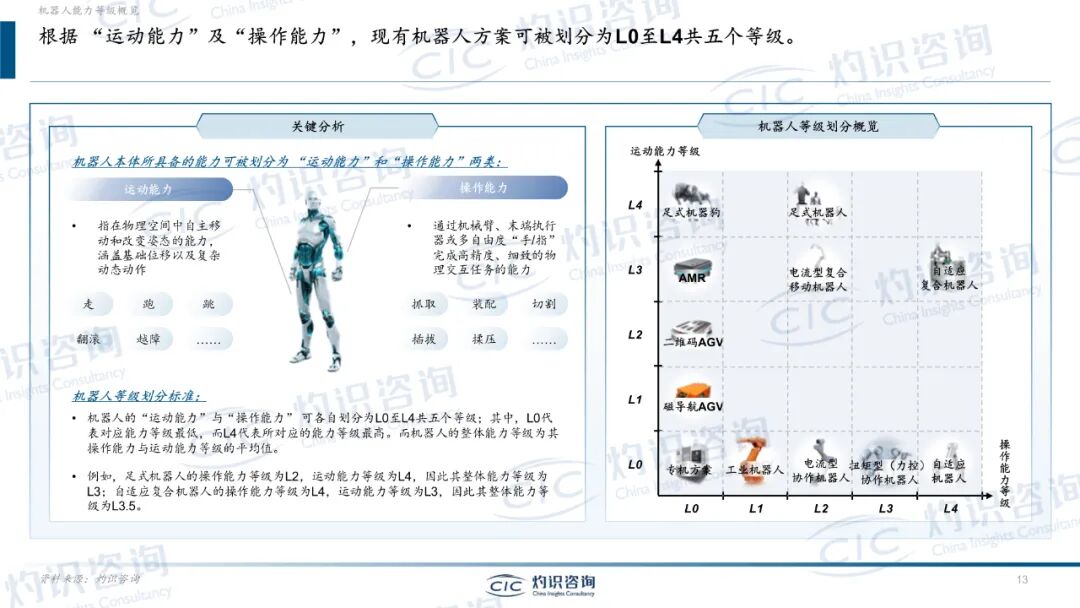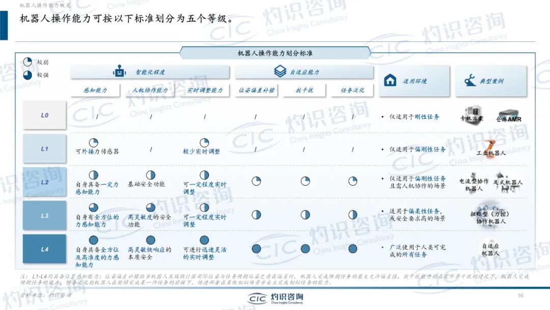 • 操作能力‌:主流处于L1-L2阶段,自适应机器人通过力控技术率先实现L4级,完成柔性插装、精密打磨等高精度作业。
