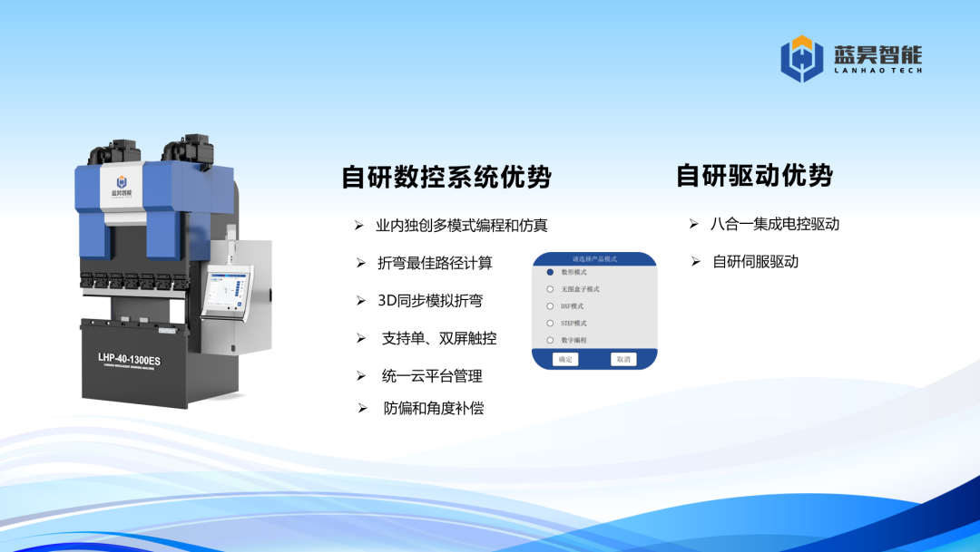 蓝昊自研纯电折弯机从数控系统、机械结构、控制电路到折弯模具完全自主研发。它采用自研驱动器和自研6轴并发联动数控系统控制,两者结合非常紧密,加上Y轴采用线轨方案,加工精度、效率远优于传统折弯机。
