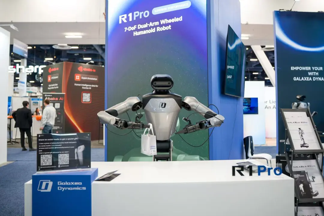 2)银河通用:“端到端具身大模型+场景化机器人”为核心,集中展示了Galbot G1在智能零售、工业物流等多元场景的应用突破及技术实力。作为银河通用的核心产品,Galbot G1依托自主研发的端到端具身大模型GroceryVLA,实现了复杂货架物品的自主识别与精准取放,无论是软包装的面包、形状不规则的水果,还是掉落物体的突发情况,均能通过吸盘与夹爪的配合稳稳处理,直接展现了零售场景无人化的未来潜力。此次参展,银河通用不仅通过模拟超市场景直观呈现了Galbot G1在智能零售领域的应用价值,更覆盖工厂物流搬运、双足人形机器人舞蹈等多场景演示,全面体现了其“具身智能+多场景落地”的技术布局与商业化能力,为具身智能从实验室走向物理世界提供了可复制的实践样本。