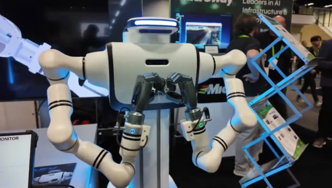 14)Richtech Robotics:美国,以“工业级移动人形机器人”为核心亮点,首次推出专为工业场景设计的轮式人形机器人Dex,集中展现其在“移动+操作”融合技术、真实环境适配及规模化部署上的突破。Dex采用轮式自主移动平台(源自旗下Titan配送机器人技术)与双机械臂的组合设计,搭载NVIDIA Jetson Thor处理器实现动态环境实时推理,支持4小时续航(移动模式),并通过NVIDIA Isaac Sim/Isaac Lab完成仿真训练,确保工业场景的稳定性与精度。其核心优势在于解决了传统工业机器人“过度专业化、难以融入现有系统”的痛点——Dex可融入企业已有生产体系,通过模块化末端执行器(灵巧手、夹爪等)适配螺栓拧紧、物料搬运、装配等工业任务,且四摄像头视觉系统支持快速变化环境中的导航与操作。目前,Dex已在真实工业环境中部署超过450台,覆盖工厂物料搬运、装配线协作等场景,验证了从仿真到实际应用的商业化闭环,为工业领域提供了一种“易融入、可规模化”的自动化解决方案。