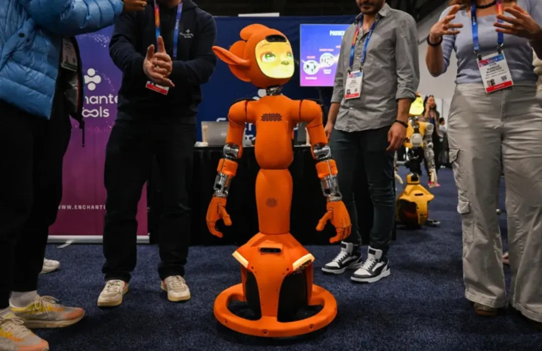 8)Enchanted Tools:法国,以“情感化交互设计”为核心,展出了桌面级人形机器人Morikai,其橙色流线型机身搭配可自由伸缩、多角度转动的仿生大耳朵,通过动态肢体语言传递情绪感知能力,成为家庭陪伴场景的创新代表。Morikai搭载模块化关节系统与柔性驱动技术,耳朵运动范围覆盖180度,能模拟点头、转头等拟人化动作,结合语音交互与触控反馈,实现主动问候、情绪响应等互动功能。该产品聚焦儿童教育与家庭娱乐场景,通过可定制化表情包与简易编程接口,支持用户自定义交互模式,同时采用低功耗设计适配长时间待机需求,展现了消费级人形机器人在情感陪伴领域的落地潜力。