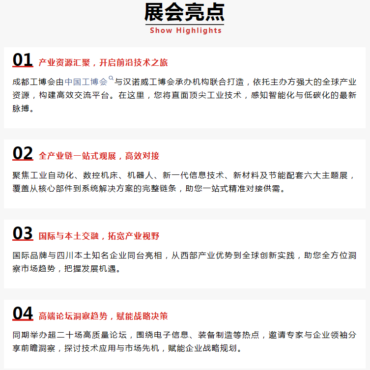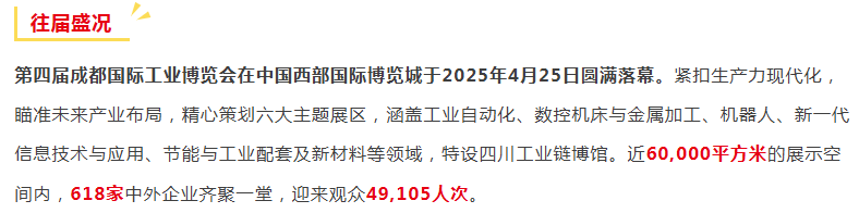 2026成都国际工业博览会(简称“成都工博会”)将于2026年3月11日-13日国西部国际博览城举办。作为由中国工博会和汉诺威工博会联合打造的工业盛会之一,成都工博会立足未来工业的高站位,精确聚焦中国智能制造,将通过展示工业自动化、数控机床与金属加工、机器人、新一代信息技术与应用(工业互联网)、节能与工业配套及新材料等智能制造产业链中的关键产品及解决方案,为上下游企业搭建高效的供需对接桥梁,促进制造业向数字化、网络化、智能化转型,推动西部工业产能新一轮发展。2026成都工博会规划面积60,000平方米,预期汇集全球800家参展企业60,000名专业观众前往参观、采购。