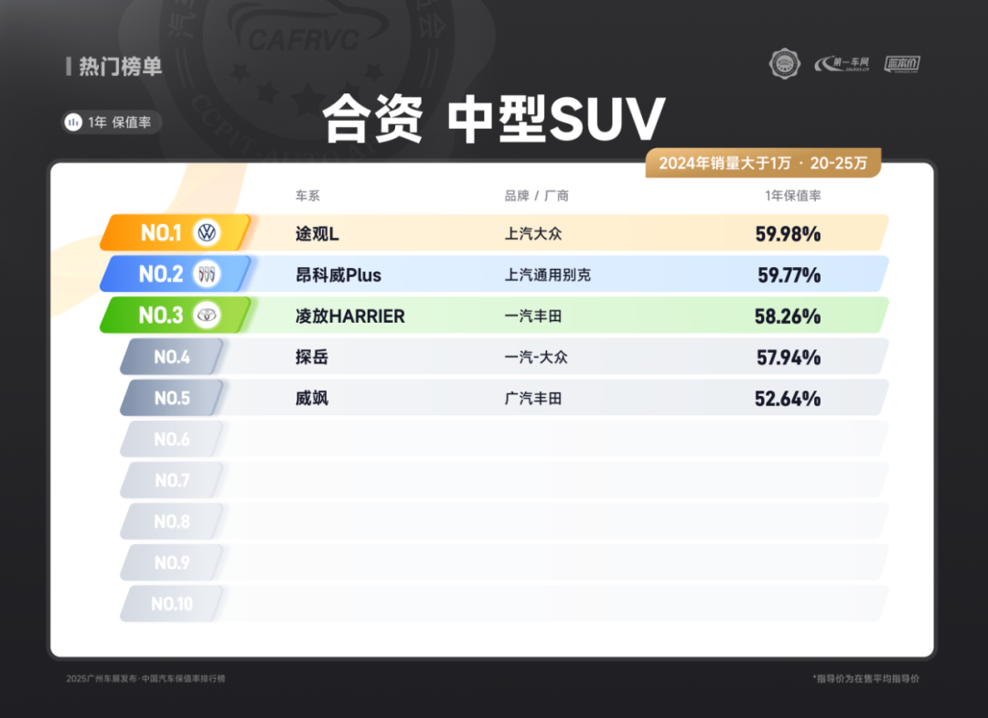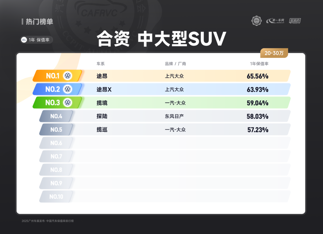 (上汽大众途昂 20-30万合资燃油中大型SUV保值率排名第一)