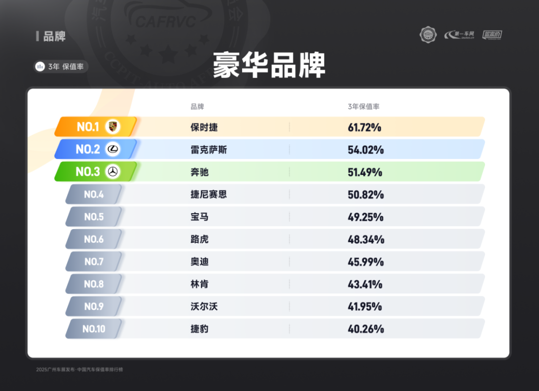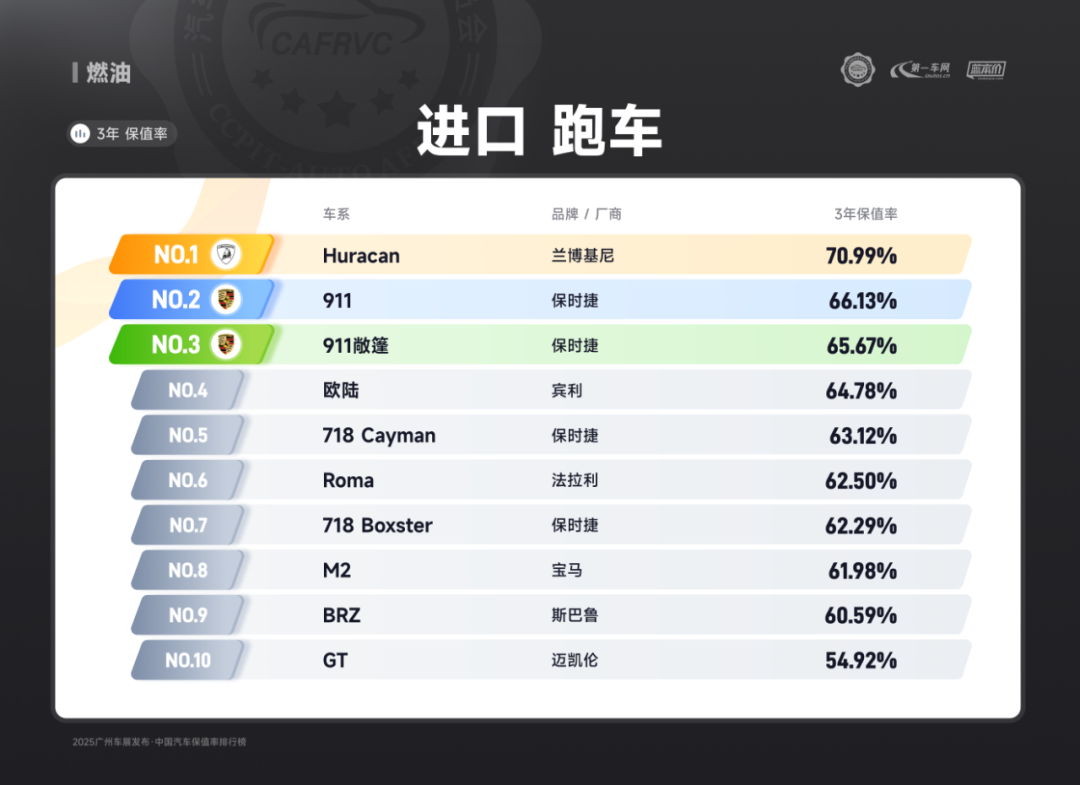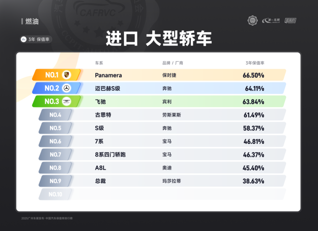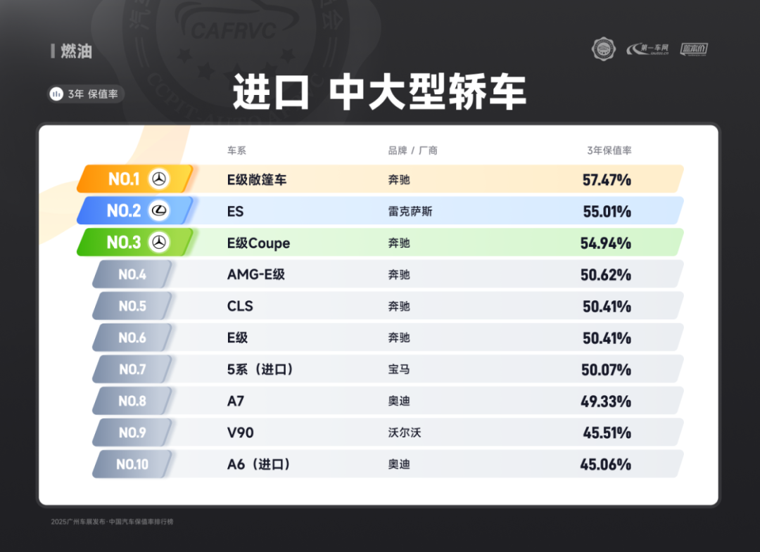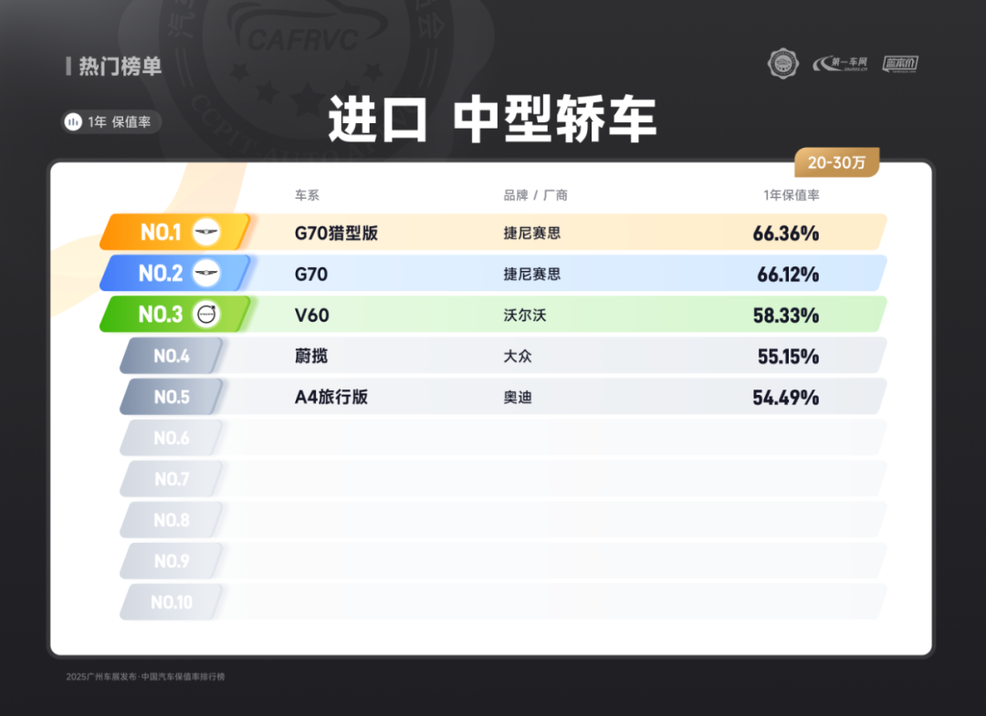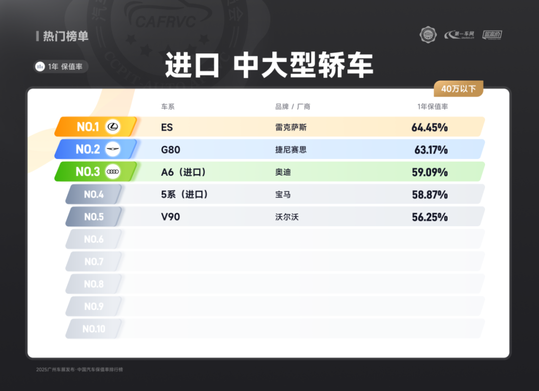 进口车型中,保时捷Panamera、雷克萨斯ES、捷尼赛思G80的保值率同样亮眼:保时捷Panamera搭载2.9T V6/4.0T V8发动机,零百加速最快仅3.8秒,空气悬架与四区空调兼顾性能与舒适;雷克萨斯ES延续品牌可靠性基因,混动系统运转静谧平顺,卓越的售后服务体系构建强大用户粘性;捷尼赛思G80提供前置后驱/四驱可选,2.5T动力匹配8挡手自一体变速箱,31.8万起的定价在豪华品牌中形成差异化竞争,4门5座布局满足高端通勤需求。除上述提到的多个高保值率车系以外,本次保值率排行还包含以下详细榜单: