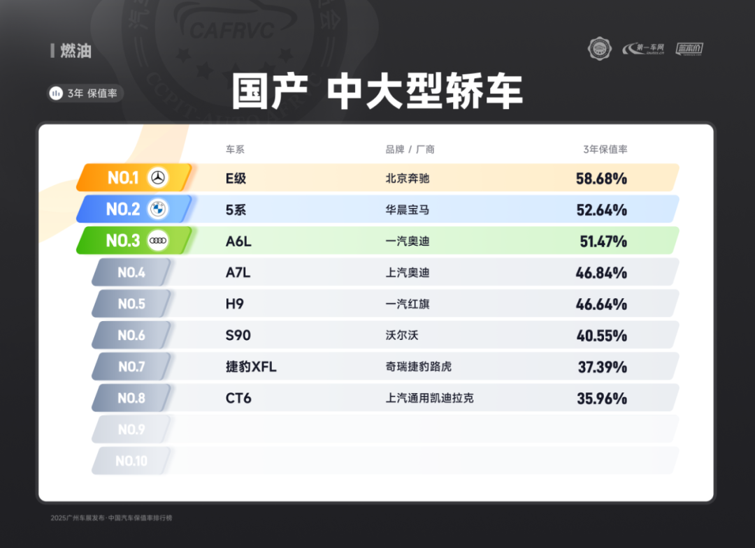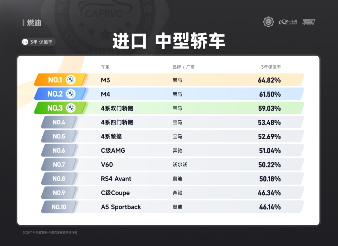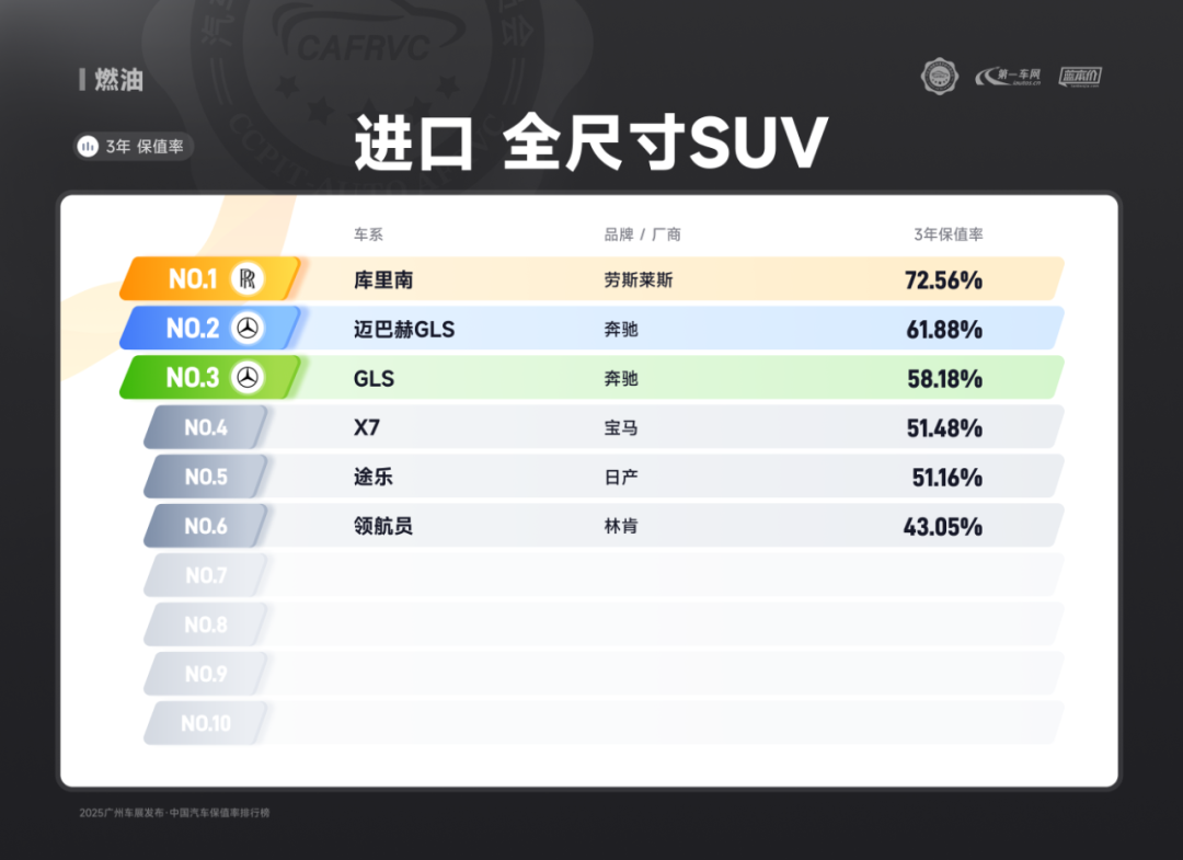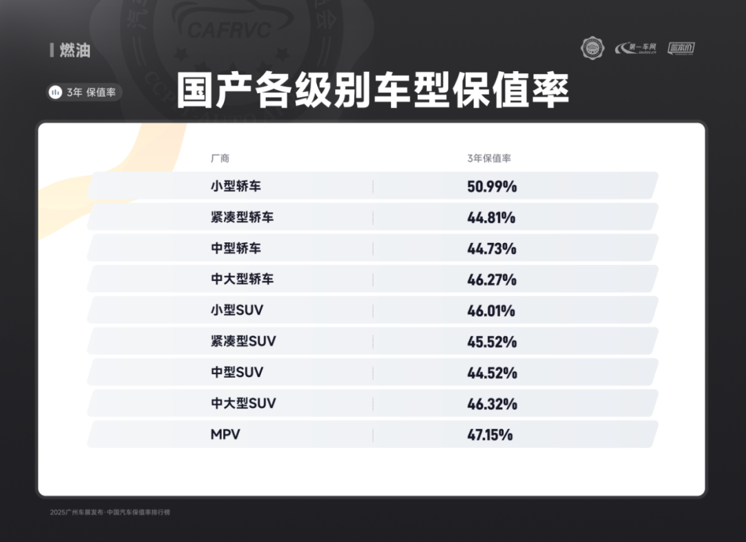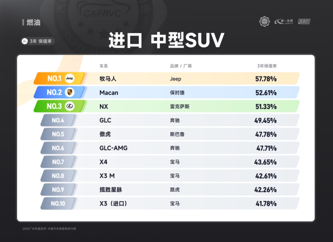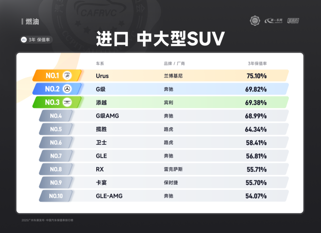 进口车型中,保时捷Panamera、雷克萨斯ES、捷尼赛思G80的保值率同样亮眼:保时捷Panamera搭载2.9T V6/4.0T V8发动机,零百加速最快仅3.8秒,空气悬架与四区空调兼顾性能与舒适;雷克萨斯ES延续品牌可靠性基因,混动系统运转静谧平顺,卓越的售后服务体系构建强大用户粘性;捷尼赛思G80提供前置后驱/四驱可选,2.5T动力匹配8挡手自一体变速箱,31.8万起的定价在豪华品牌中形成差异化竞争,4门5座布局满足高端通勤需求。除上述提到的多个高保值率车系以外,本次保值率排行还包含以下详细榜单: