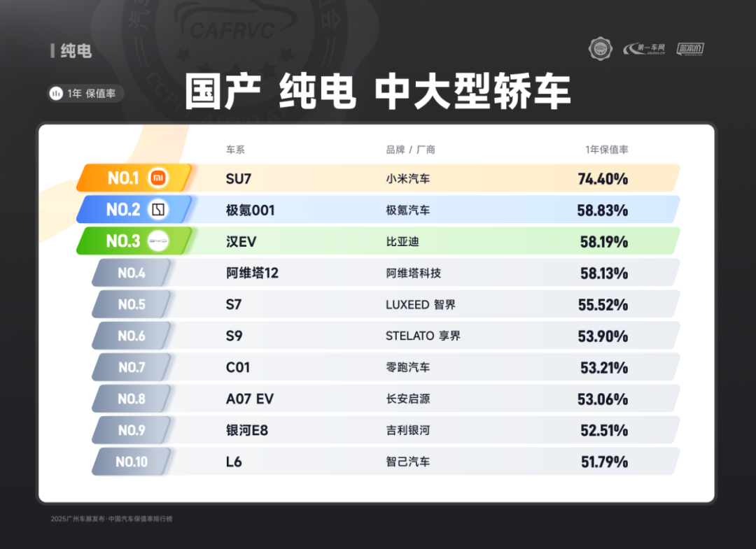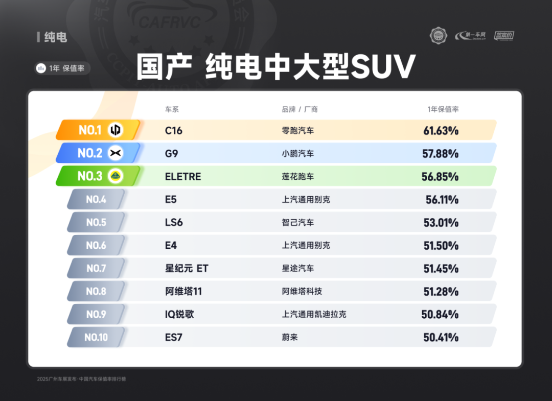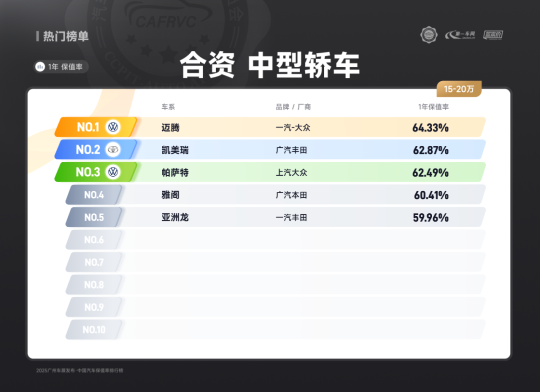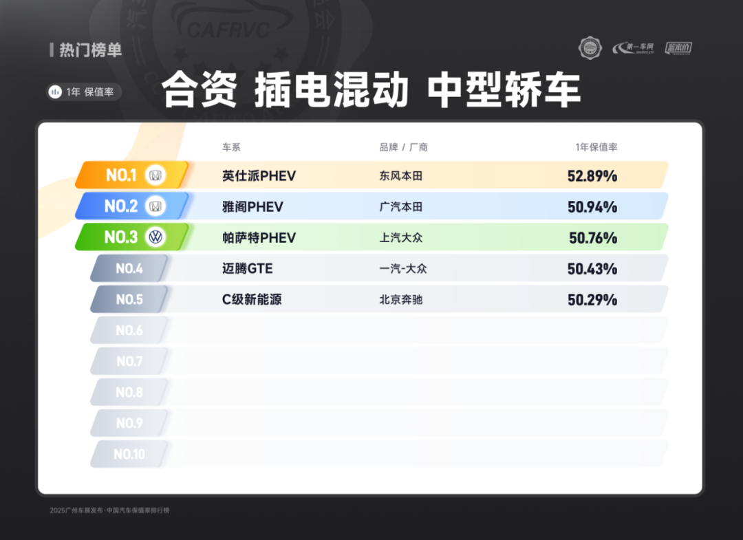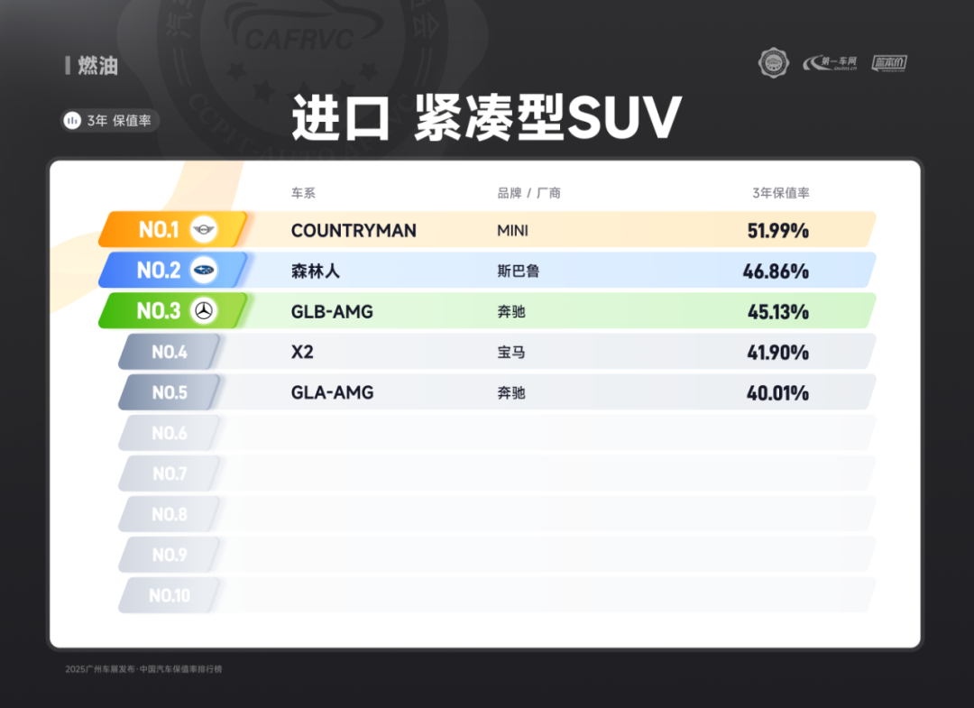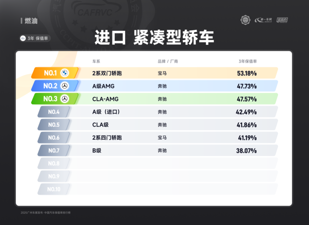 进口车型中,保时捷Panamera、雷克萨斯ES、捷尼赛思G80的保值率同样亮眼:保时捷Panamera搭载2.9T V6/4.0T V8发动机,零百加速最快仅3.8秒,空气悬架与四区空调兼顾性能与舒适;雷克萨斯ES延续品牌可靠性基因,混动系统运转静谧平顺,卓越的售后服务体系构建强大用户粘性;捷尼赛思G80提供前置后驱/四驱可选,2.5T动力匹配8挡手自一体变速箱,31.8万起的定价在豪华品牌中形成差异化竞争,4门5座布局满足高端通勤需求。除上述提到的多个高保值率车系以外,本次保值率排行还包含以下详细榜单: