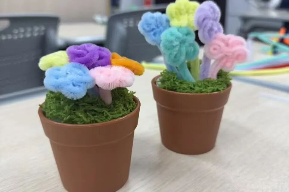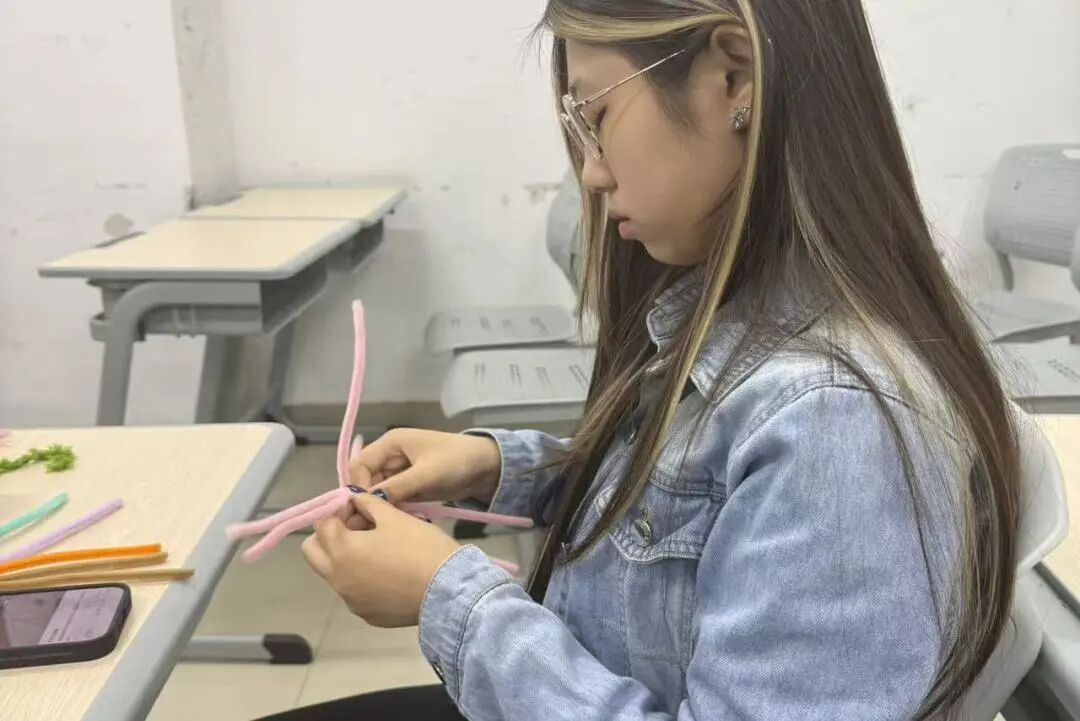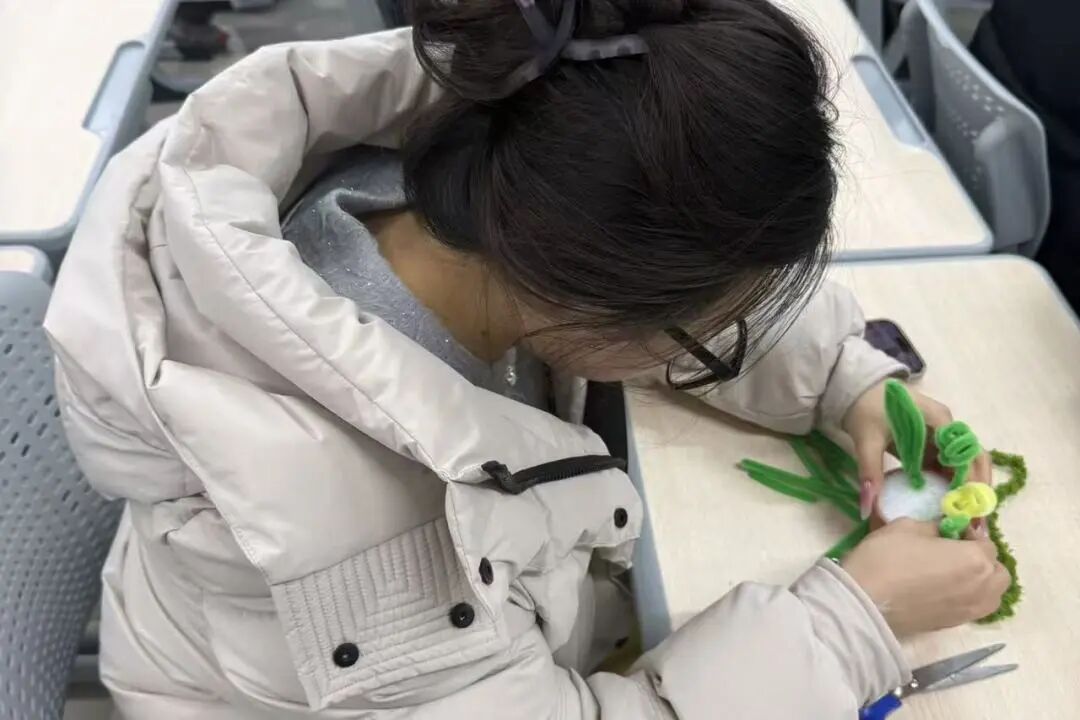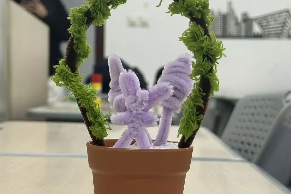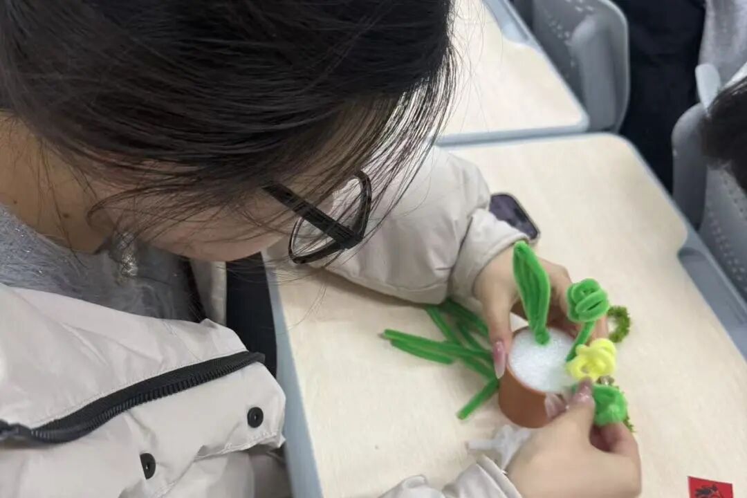 活动现场,我们每个人都能领到专属的手工材料包,色彩丰富的扭扭棒、小巧的花盆,还有各种各样的装饰小物件,足够我们尽情发挥创意、释放灵感。拿起扭扭棒,一点点缠绕、弯折,从杂乱无章的线条,慢慢勾勒出叶片的舒展、花朵的娇艳,再小心翼翼地将这份“绿意”放进小花盆,每一个步骤都充满了专注与欢喜,每一次弯折都承载着我们对绿色的向往。