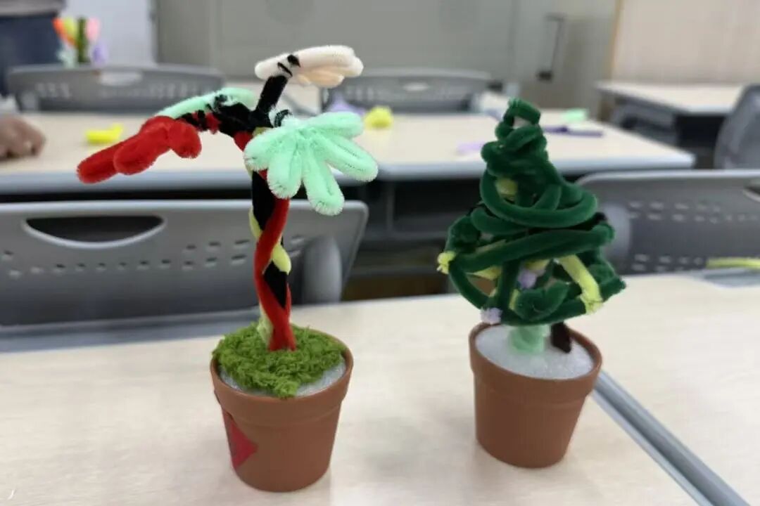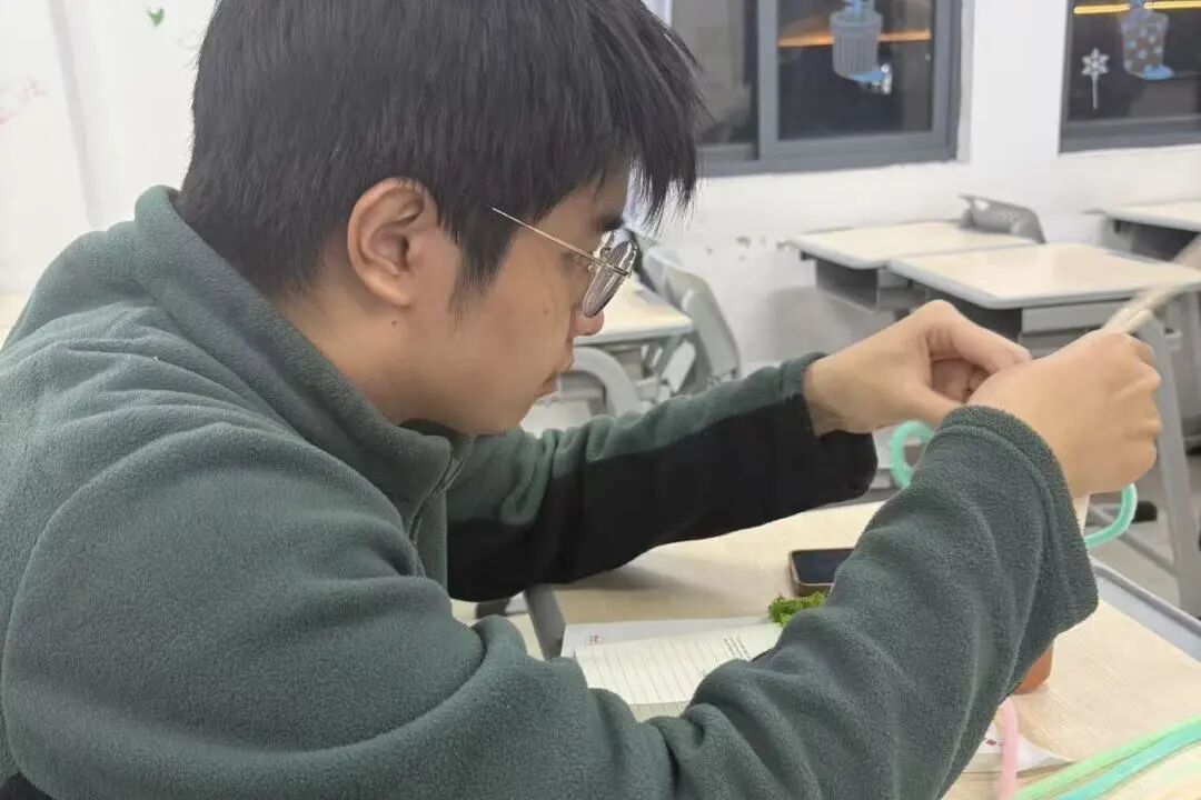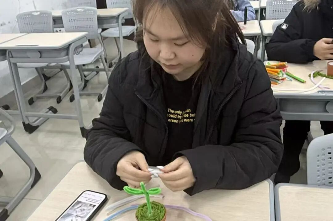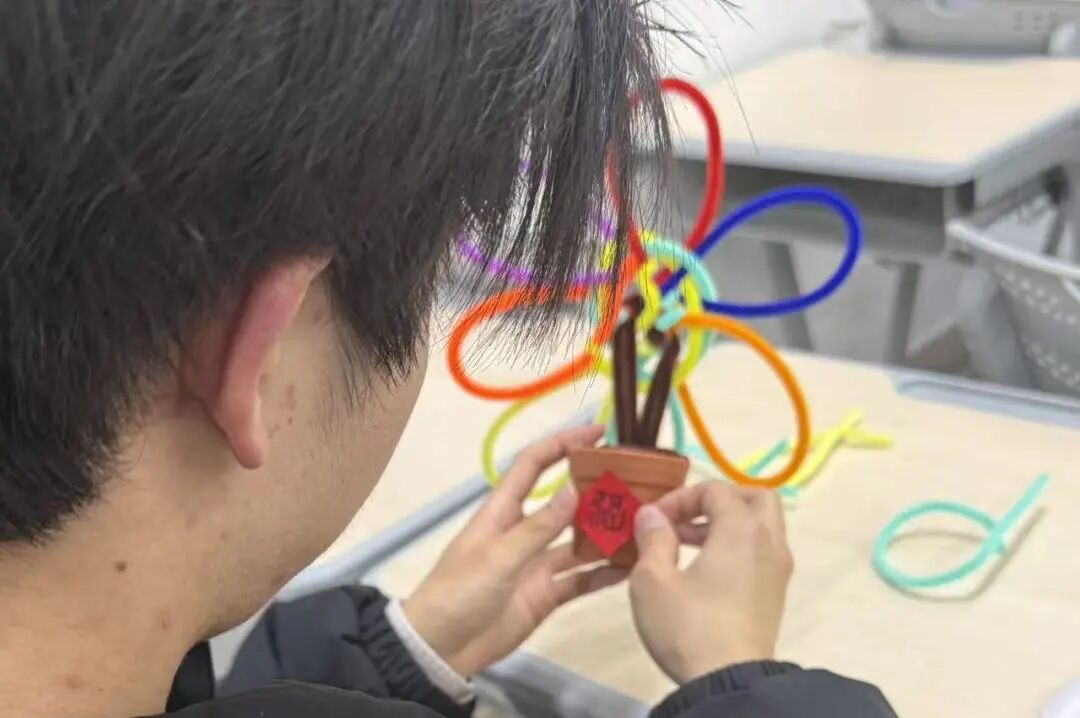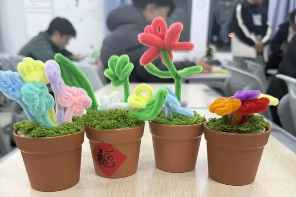 活动现场,我们每个人都能领到专属的手工材料包,色彩丰富的扭扭棒、小巧的花盆,还有各种各样的装饰小物件,足够我们尽情发挥创意、释放灵感。拿起扭扭棒,一点点缠绕、弯折,从杂乱无章的线条,慢慢勾勒出叶片的舒展、花朵的娇艳,再小心翼翼地将这份“绿意”放进小花盆,每一个步骤都充满了专注与欢喜,每一次弯折都承载着我们对绿色的向往。