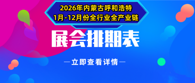 展会排期网-zhxxpq.com花费大量人力物力,坚持为大家整理编辑各地展会排期表,只因为我们知道这是您想要的信息,我们坚持做一个有内容、有价值的网络服务平台。据不完全统计,2026年1月-12月份内蒙古呼和浩特全行业已知大小规模展会活动有近28场+...... 2026年即将有众多大牌展会悉数登场,行业涵盖了餐饮、大健康、家博会、清洁用品、烘焙、保健、跨境电商、食品、食品设备、纺织、酒店用品、跨境电商、半导体、五金、铁路轨道、汽车、化妆品、服装、机床、清洁用品、珠宝、宠物、家居、茶博会、农机、美容美妆展等多个领域。哪些精彩展会值得您重点关注和参与?敬请持续留意我们后续发布的详细展会信息排期预报哦!