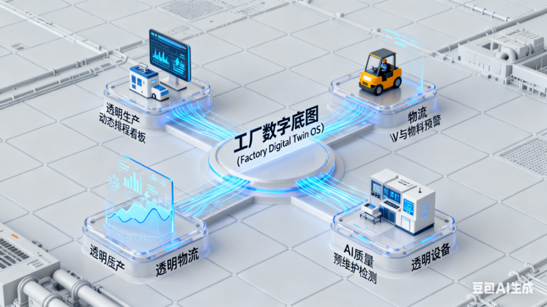 透明工厂的核心,是“一张实时运行的工厂数字底图”(Factory Digital Twin OS),包括四个维度: