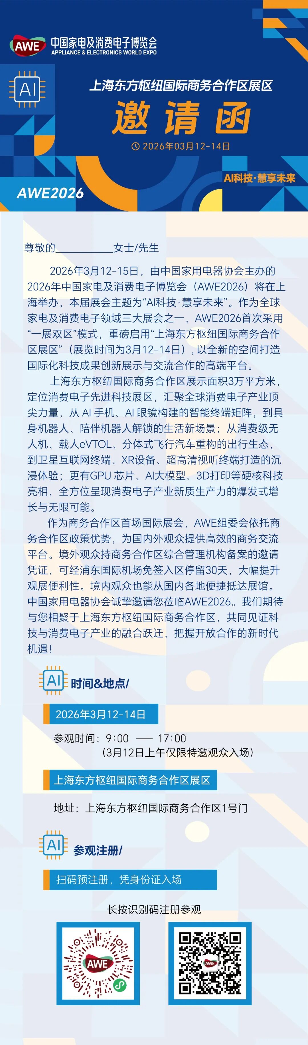 邀请您参观中国家电及消费电子展AWE2026上海东方枢纽国际商务合作区展区