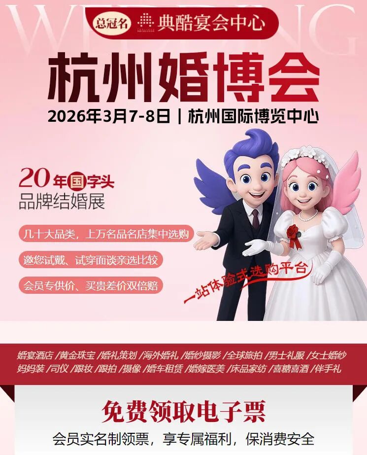 2026春季杭州婚博会将于3月7-8日(9:30-20:00)杭州国际博览中心举办。本届展出品类囊括婚纱照、婚宴酒店、婚庆婚礼策划、四大金刚、婚戒三金五金、婚纱礼服、新郎西装、喜糖喜酒伴手礼、新婚家纺、婚车租赁……全都有,2天逛展一站购齐,省去东奔西跑,关键价格还优于门店,为您的婚礼精打细算!