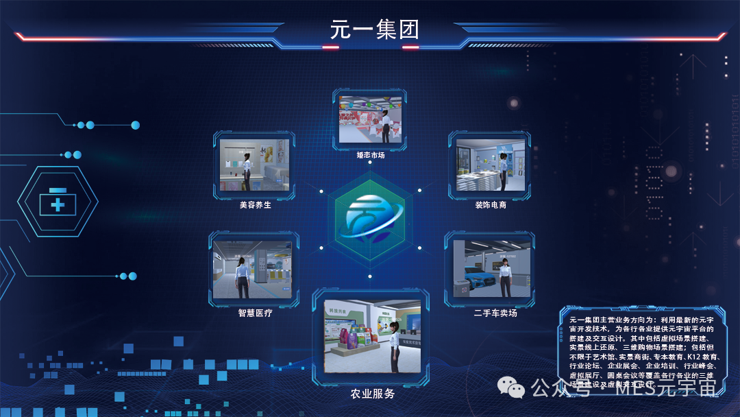 元一集团利用最新的元宇宙开发技术,为各行各业提供元宇宙平台的搭建及交互设计。其中包括虚拟场景搭建、实景线上还原、三维购物场景搭建;包括但不限于艺术馆、实景商街、专本教育、K12教育、行业论坛、企业展会、企业培训、行业峰会、虚拟展厅、圆桌会议等覆盖各行各业的三维场景建设及虚拟交互设计。
