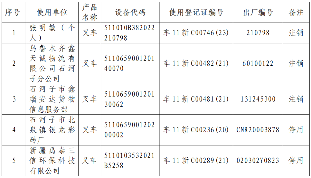 经核查,本公告所列的特种设备产权单位及特种设备使用单位的5台特种设备检验已过期,且该设备的使用单位和产权单位已注销、倒闭、迁移或失联,第八师市场监督管理局及特种设备检验机构均无法联系该设备的使用单位。现决定所列特种设备予以公告停用或注销。