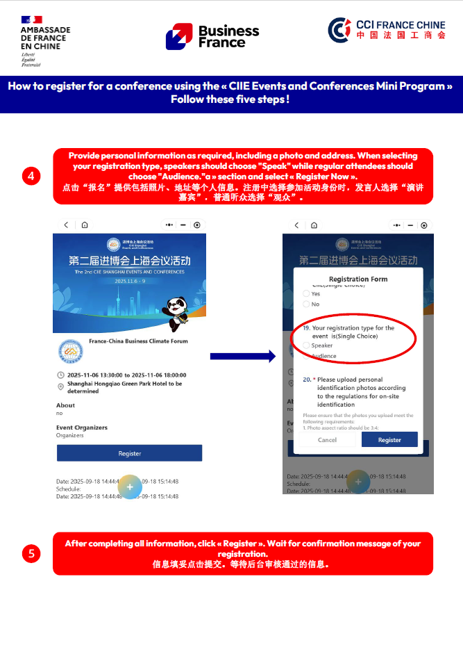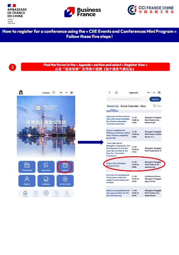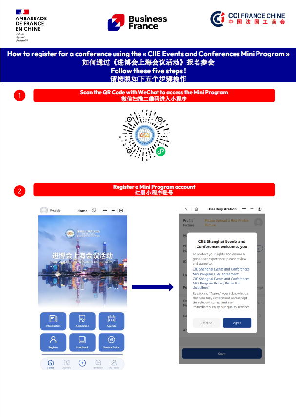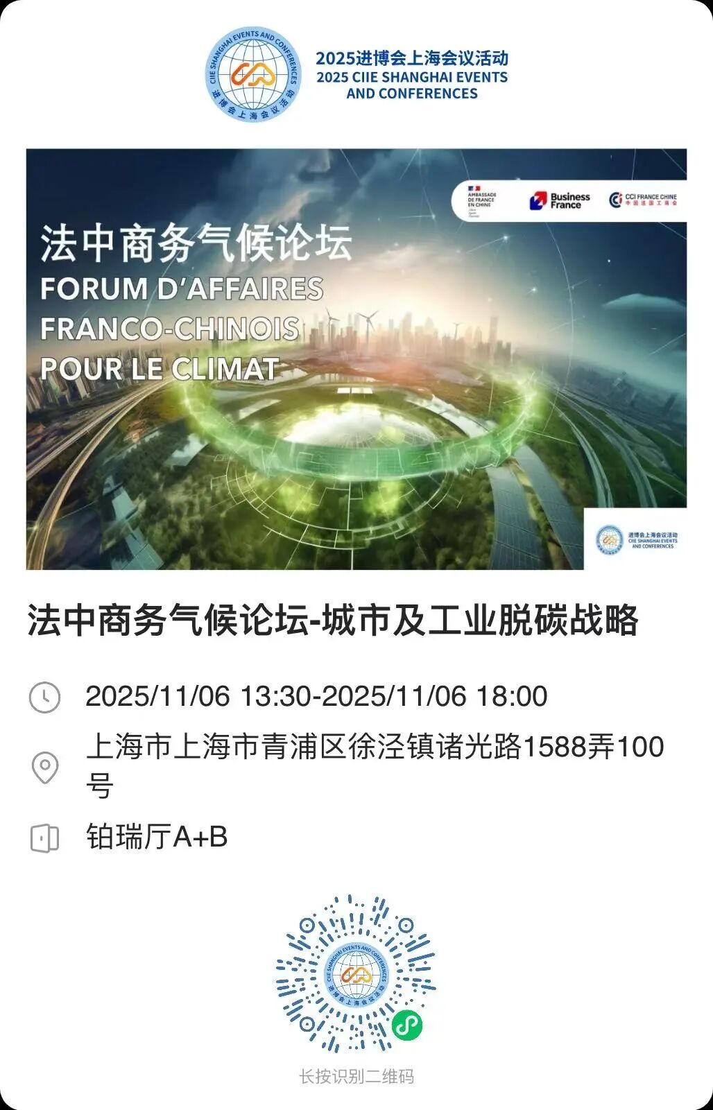 我们诚挚邀请关注脱碳转型、绿色能源与可持续发展的中国企业、专家学者及机构代表踊跃参与。报名请扫描下方二维码,进入“进博会上海会议活动”官方小程序,注册账号后于活动列表中选择“法中商务气候论坛”完成报名。期待与您共商绿色未来!