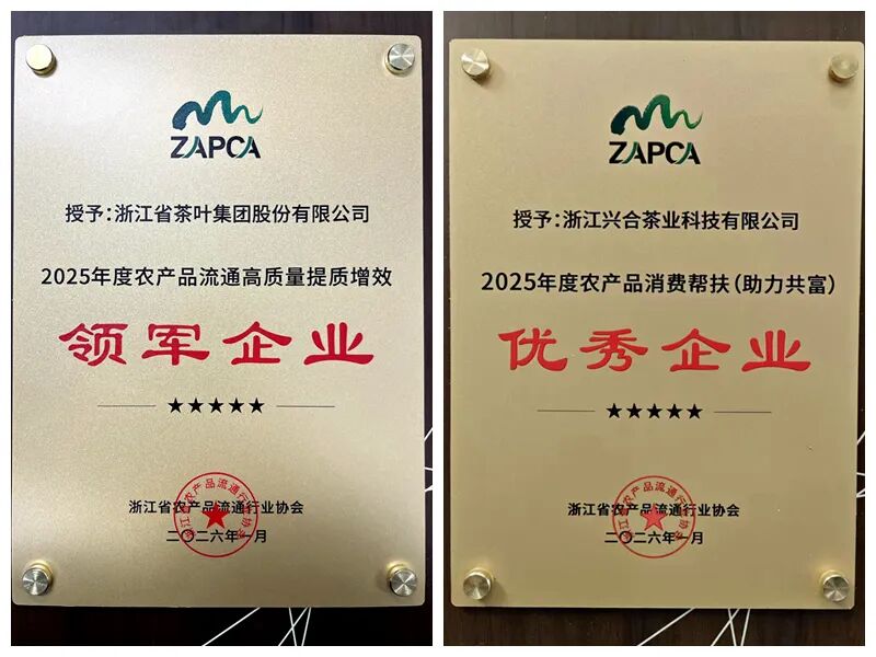 近日,浙江省农产品流通行业协会第三届三次会员大会暨2026高质量提质增效发展大会在杭州召开。浙茶股份及其成员企业兴合茶业科技公司分别荣获“2025年度农产品流通高质量提质增效领军企业”“2025年度农产品消费帮扶(助力共富)优秀企业”称号。
