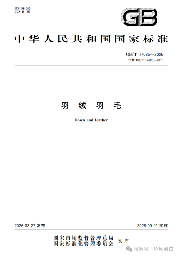 近日,《羽绒羽毛》新国标(GB/T 17685-2026)正式发布,将于9月1日起开始实施。《羽绒羽毛》标准是羽绒行业基础性的国家标准,也是羽绒服装、羽绒寝具等下游产品标准制定的重要依据,该项国家标准由中国羽绒工业协会组织制定,安徽华隽羽绒制品有限公司作为主要起草单位之一,全程参与了新国标的修订工作。
