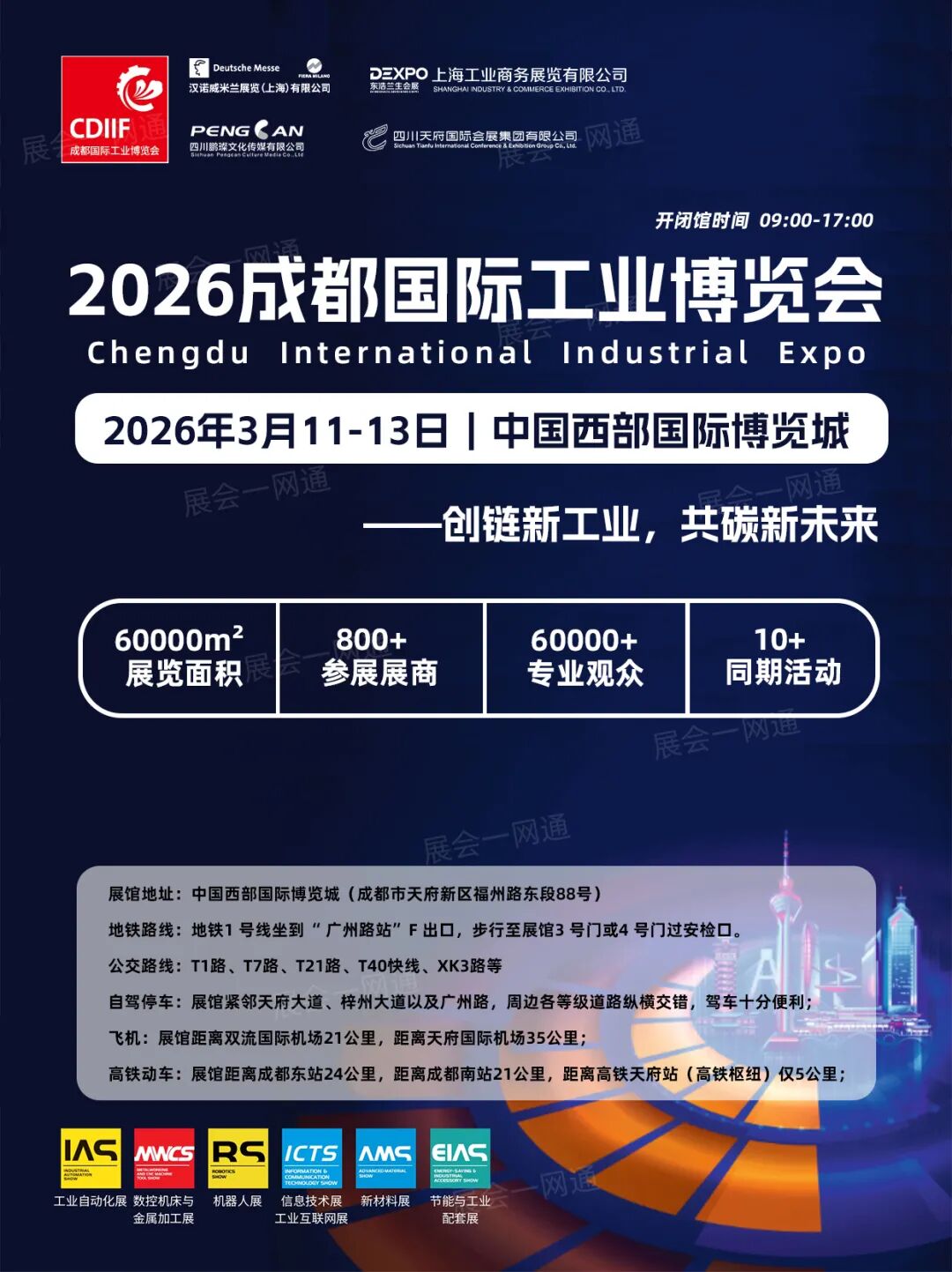 2026成都国际工业博览会(简称:成都工博会)将于2026年3月11日-13日在中国西部国际博览城举办。2026成都工博会规划面积60,000平方米,预期汇集全球800家参展企业,60,000名专业观众前往参观、采购。作为由中国工博会和汉诺威工博会联合打造的工业盛会之一,成都工博会立足未来工业的高站位,精确聚焦中国智能制造,将通过展示工业自动化、数控机床与金属加工、机器人、新一代信息技术与应用(工业互联网)、节能与工业配套及新材料等智能制造产业链中的关键产品及解决方案,为上下游企业搭建高效的供需对接桥梁,促进制造业向数字化、网络化、智能化转型,推动西部工业产能新一轮发展。
