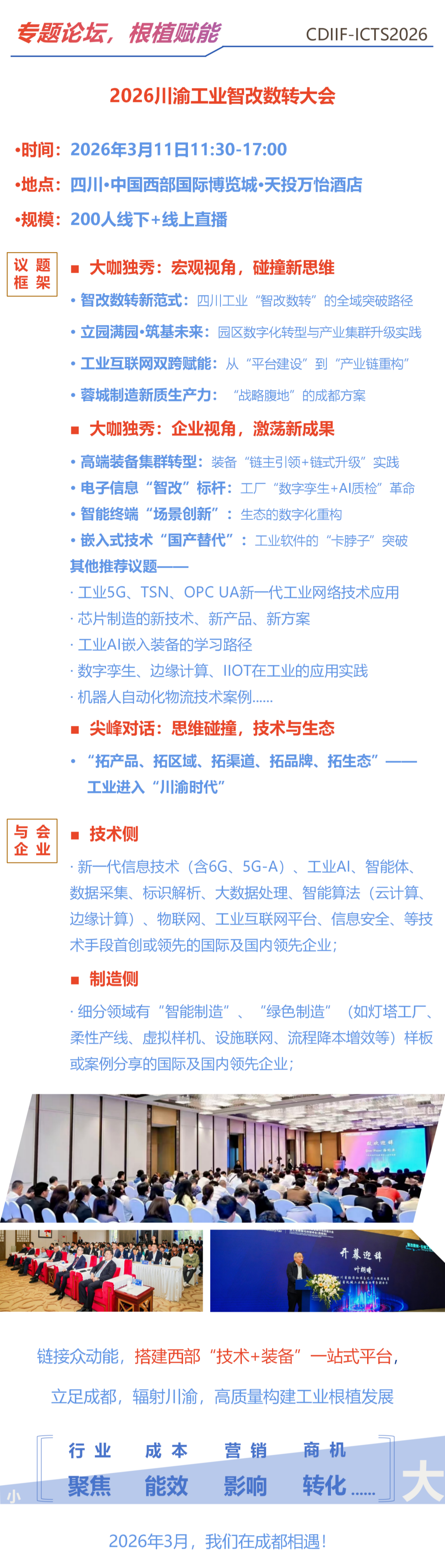 新一代信息技术与应用展/工业互联网展,作为成都工博会核心版块之一,将以"一核两区"的呈现形式,并配套专题论坛一一川渝工业智改数转大会,聚焦西部地区产业智改数转真实需求,重新定义工业数智化发展新范式!