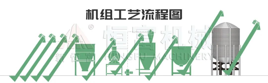 机组前端搭配清理粮和除铁装置,可以把物料中杂质有效剔除,保护整套设备正常高效的运行;中间配置的设备是水滴型饲料粉碎机、卧式单轴双螺带饲料混合机、逆流式饲料冷却器来完成物料粉碎制粒冷却过程;末端配置饲料破碎机可以有效提升整套颗粒饲料机组的产量。