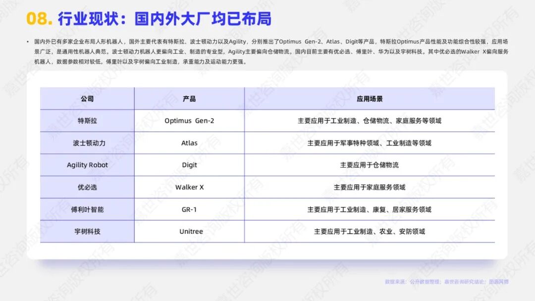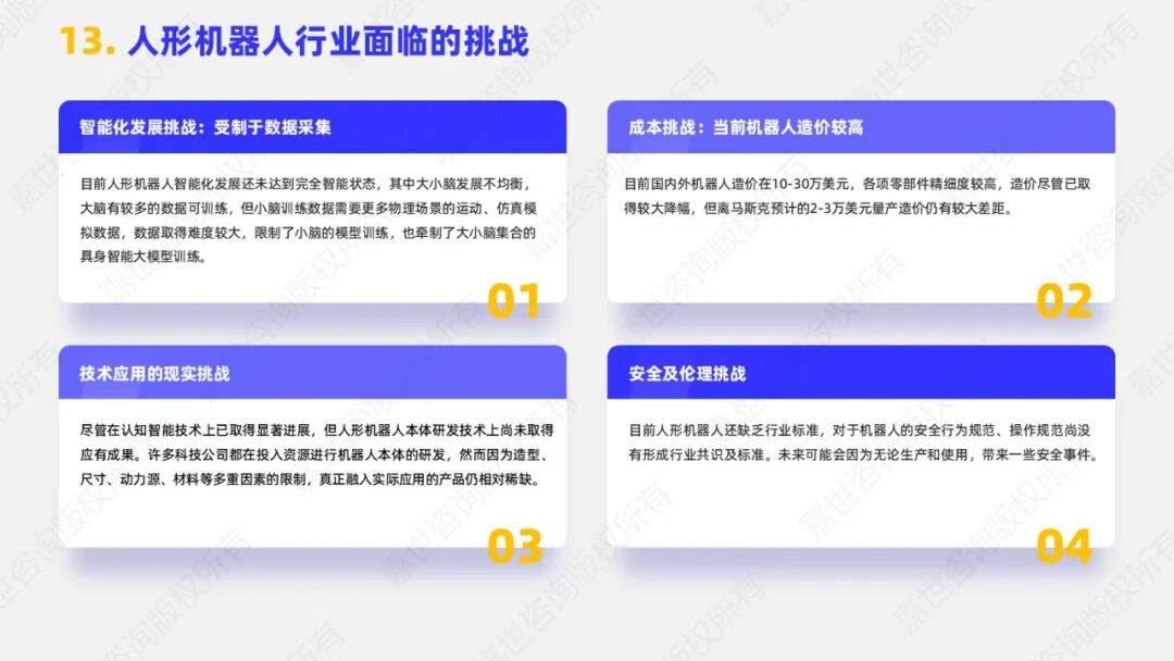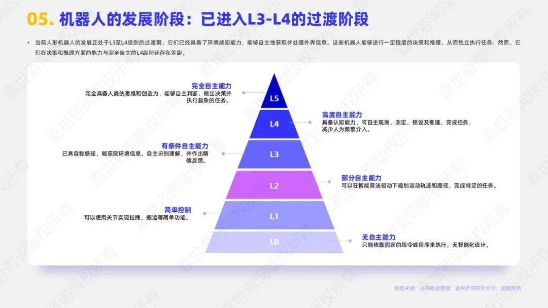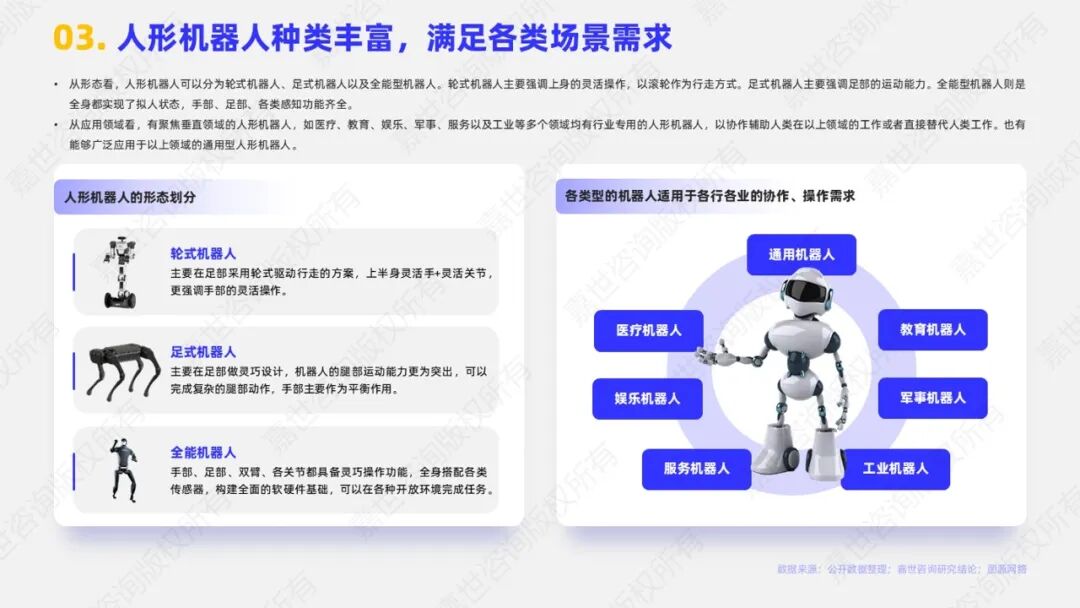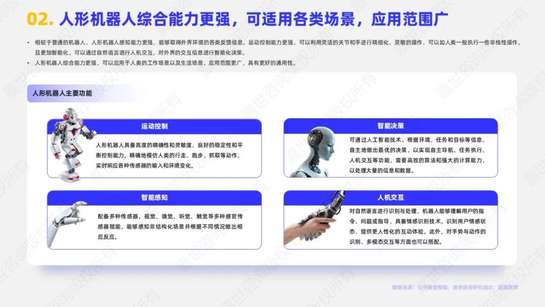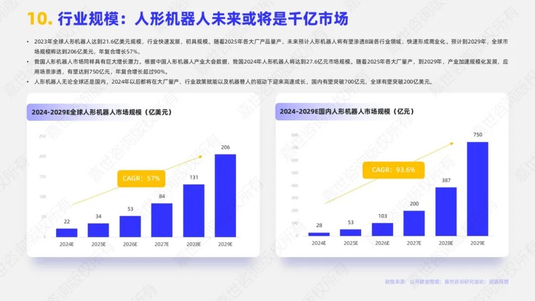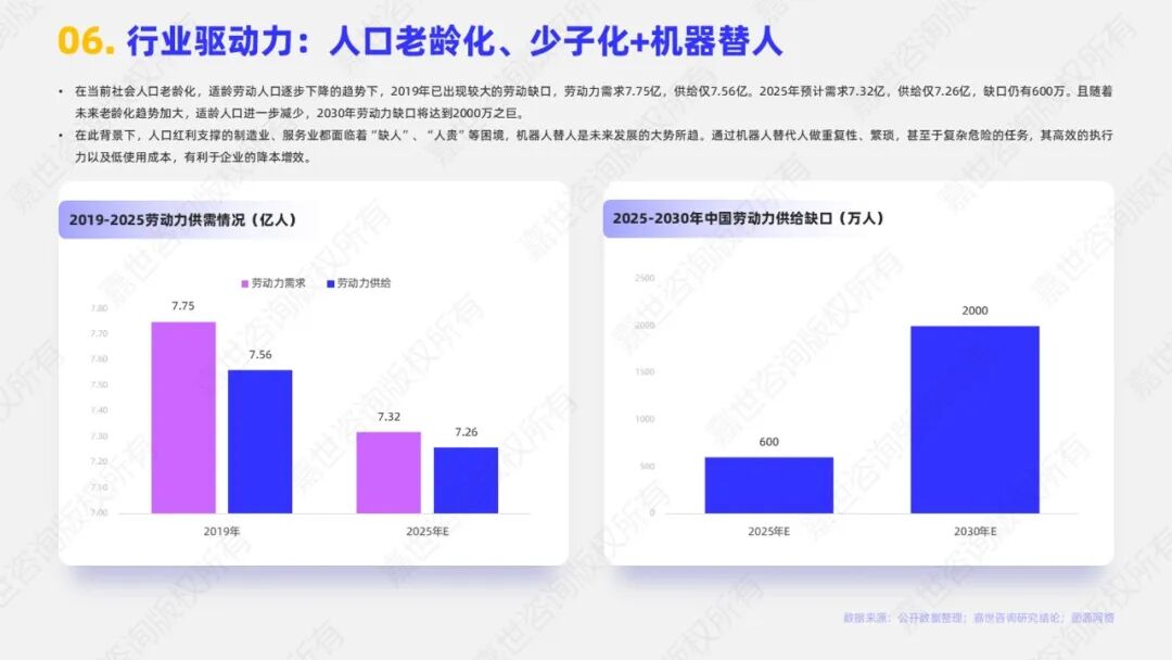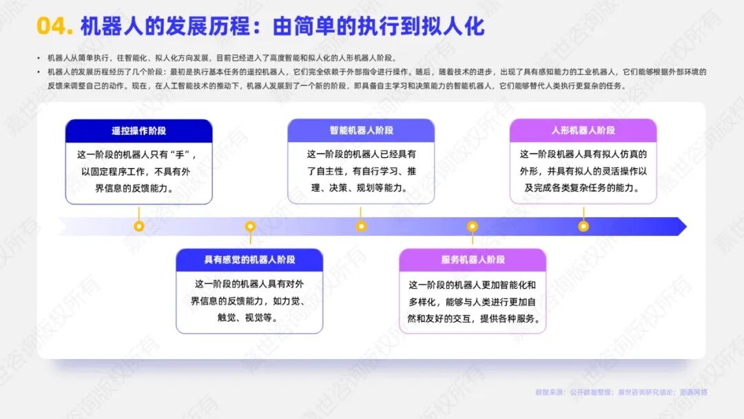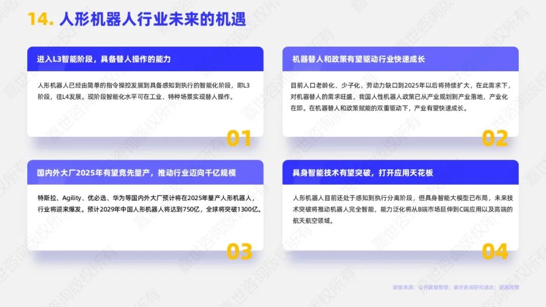 人形机器人,也叫仿生机器人,其形状、外观以及大小与人相似,并且可以模拟人跟外界交互方式、动作、形态以及表情,也可以实现如人类一般的智能决策。人形机器人技术发展是基于多学科基础沉淀,集成高端精密制造、新材料、人工智能等先进技术,来实现拟人化的功能,任务操作更多元、人机交互更亲和、环境适应更通用,是有望成为新能源汽车、智能手机后的颠覆性产品。它由感知系统及智能系统、灵活手和关节以及两个执行器(旋转执行器和线性执行器)构成,感知系统模拟人的感官获取对外界的信息、智能系统模拟人的大脑做决策,而灵活手和关节则是模拟人的手部和关节,实现精确操作。旋转执行器用于模拟柔性的动作,线性执行器推动行走。从而实现从形态上、行为动作上以及决策上拟人化。人形机器人综合能力更强,可适用各类场景,应用范围广相较于普通的机器人,人形机器人感知能力更强,能够取得外界环境的各类反馈信息。运动控制能力更强,可以利用灵活的关节和手进行精细化、灵敏的操作,可以如人类一般执行一些非线性操作。且更加智能化,可以通过自然语言进行人机交互,对外界的交互信息进行智能化决策。人形机器人综合能力更强,可以应用于人类的工作场景以及生活场景,应用范围更广,具有更好的通用性。从形态看,人形机器人可以分为轮式机器人、足式机器人以及全能型机器人。轮式机器人主要强调上身的灵活操作,以滚轮作为行走方式。足式机器人主要强调足部的运动能力。全能型机器人则是全身都实现了拟人状态,手部、足部、各类感知功能齐全。从应用领域看,有聚焦垂直领域的人形机器人,如医疗、教育、娱乐、军事、服务以及工业等多个领域均有行业专用的人形机器人,以协作辅助人类在以上领域的工作或者直接替代人类工作。也有能够广泛应用于以上领域的通用型人形机器人。机器人从简单执行,往智能化、拟人化方向发展,目前已经进入了高度智能和拟人化的人形机器人阶段。机器人的发展历程经历了几个阶段:最初是执行基本任务的遥控机器人,它们完全依赖于外部指令进行操作。随后,随着技术的进步,出现了具有感知能力的工业机器人,它们能够根据外部环境的反馈来调整自己的动作。现在,在人工智能技术的推动下,机器人发展到了一个新的阶段,即具备自主学习和决策能力的智能机器人,它们能够替代人类执行更复杂的任务。当前人形机器人的发展正处于L3至L4级别的过渡期,它们已经具备了环境感知能力,能够自主地获取并处理外界信息。这些机器人能够进行一定程度的决策和推理,从而独立执行任务。然而,它们在决策和推理方面的能力与完全自主的L4级别还存在差距。在当前社会人口老龄化,适龄劳动人口逐步下降的趋势下,2019年已出现较大的劳动缺口,劳动力需求7.75亿,供给仅7.56亿。2025年预计需求7.32亿,供给仅7.26亿,缺口仍有600万。且随着未来老龄化趋势加大,适龄人口进一步减少,2030年劳动力缺口将达到2000万之巨。在此背景下,人口红利支撑的制造业、服务业都面临着“缺人”、“人贵”等困境,机器人替人是未来发展的大势所趋。通过机器人替代人做重复性、繁琐,甚至于复杂危险的任务,其高效的执行力以及低使用成本,有利于企业的降本增效。2021年以来,中央针对机器人产业陆续发布了《“十四五”机器人产业发展规划》、《“机器人+"应用行动实施方案》、《人形机器人创新发展指导意见》等政策,政策密集发布推动产业发展。政策从推动机器人产业到具体推动人形机器人产业发展,从产业规划到具体的行业应用实施方案及挂帅工作,政策逐步从技术发展到产业落地,施力重心转向产业化,将驱动产业的规模化发展。国内外已有多家企业布局人形机器人,国外主要代表有特斯拉、波士顿动力以及Agility,分别推出了Optimus Gen-2、Atlas、Digit等产品,特斯拉Optimus产品性能及功能综合性较强,应用场景广泛,是通用性机器人典范。波士顿动力机器人更偏向工业、制造的专业型,Agility主要偏向仓储物流。国内目前主要有优必选、傅里叶、华为以及宇树科技。其中优必选的Walker X偏向服务机器人,数据参数相对较低。傅里叶以及宇树偏向工业制造,承重能力及运动能力更强。国内外主要的人形机器人厂家,从特斯拉、Agility、优必选、华为等,产品已经过了测试和验证阶段,其人形机器人产品量产时间表均已初步公布,3家在2025年将实现量产,特斯拉的Optimus也将于2026年实现量产,预计2025-2026将成为人形机器人量产元年,人形机器人量产在即。2023年全球人形机器人达到21.6亿美元规模,行业快速发展,初具规模。随着2025年各大厂产品量产,未来预计人形机器人将有望渗透B端各行业领域,快速形成商业化。预计到2029年,全球市场规模将达到206亿美元,年复合增长57%。我国人形机器人市场同样具有巨大增长潜力。根据中国人形机器人产业大会数据,我国2024年人形机器人将达到27.6亿元市场规模。随着2025年各大厂量产,到2029年,产业加速规模化发展,应用场景渗透,有望达到750亿元,年复合增长超过90%。人形机器人无论全球还是国内,2024年以后都将在大厂量产、行业政策赋能以及机器替人的驱动下迎来高速成长,国内有望突破700亿元,全球有望突破200亿美元。目前阶段的人形机器人其运动操作是借由仿生大脑和仿