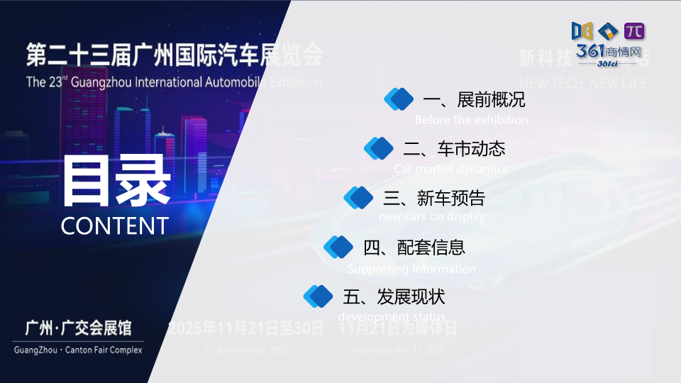 - 时间与主题:第二十三届广州国际车展将于2025年11月21日至30日在中国进出口商品交易会展馆举办,主题为“新科技・新生活”。