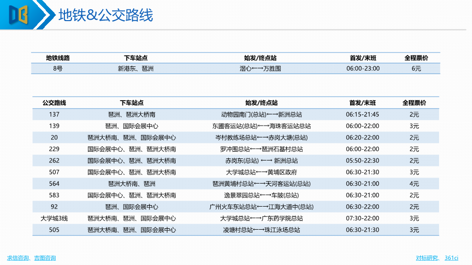 - 提供了详细的展馆平面图、交通路线(地铁、公交)、广州文旅资源(美食、茶楼、景点)及展馆周边酒店推荐,服务于参展观众的综合需求。