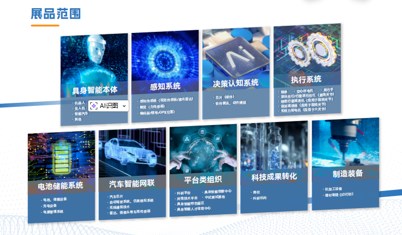 具身智能本体展区将是人形机器人、仿生机器人与工业智能机器人的竞技场,从双足行走的通用人形机器人到新一代工业协作机器人,汇聚定义未来的“终极终端”。感知系统展区聚焦视觉传感器、激光雷达、力传感器等关键部件,呈现如何为机器人赋予敏锐感知能力。决策认知系统展区集中展示高算力芯片、复杂场景决策算法与高精度动作捕捉技术,解码自主感知、动态规划与精准交互的核心逻辑。此外,执行系统、电池储能系统、汽车智能网联、平台类组织、科技成果转化、制造装备等展区同步亮相,一站式覆盖从芯片到算法、从核心部件到整机本体的全产业链。