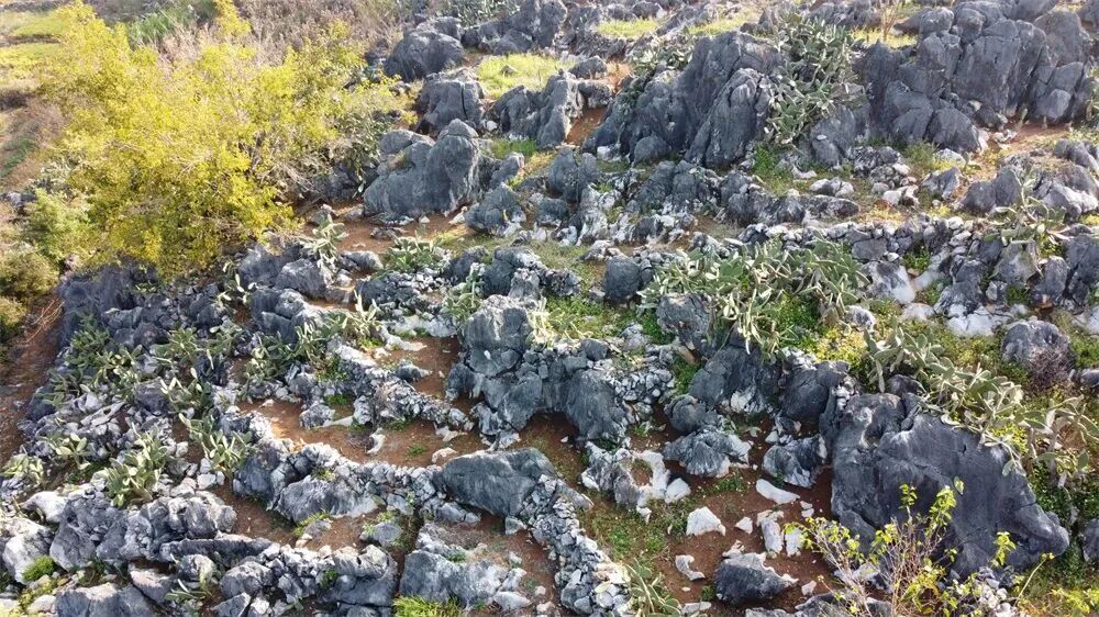 从空中俯瞰庄子田,村庄依山就势,一眼望去密密麻麻的石头块,就是典型的喀斯特地貌。石漠化超8成,锁不住水,以前这样的山坡,只能长野草。现在种了仙人掌,大幅度提升土壤锁土锁水锁肥的能力,对生态环境特别友好。