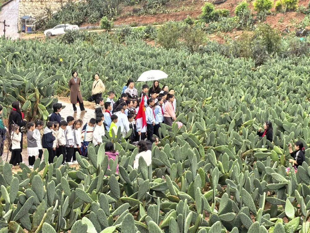 仙人掌绿了山头、红了日子,连续举办庄子田“仙人掌文化旅游节”,去年接待游客突破10万人次。图为周边学校师生到庄子田村开展研学活动。文山市委宣传部 供图