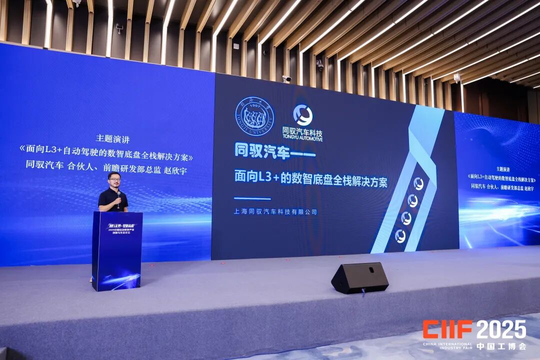 展会同期,同驭前瞻研发部总监赵欣宇受邀出席“2025中国自动驾驶产业创新与生态论坛”,并发表主题演讲。赵欣宇深入剖析了线控底盘技术作为实现L3及以上级别自动驾驶“执行基石”的核心价值,系统阐述了高阶自动驾驶对底盘系统提出的新要求与新挑战,强调必须通过定制化的完整底盘解决方案,才能有效应对当前多样化的自动驾驶场景需求。