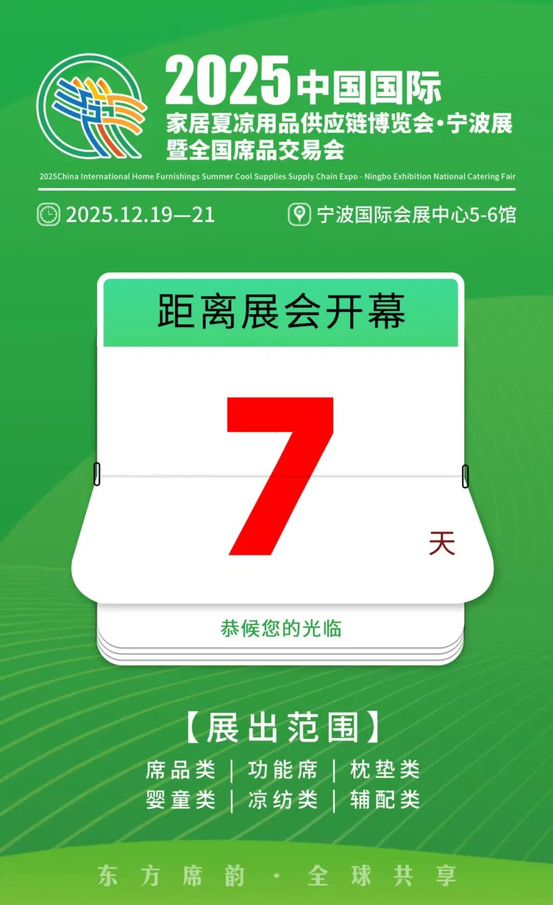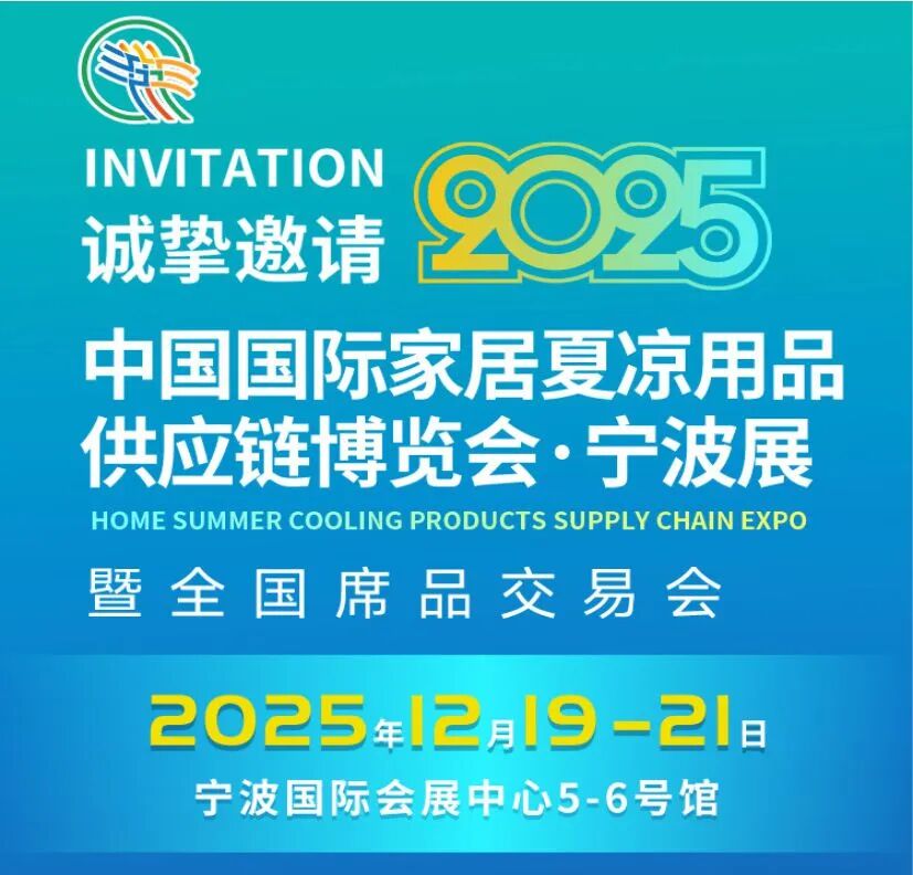 感谢您对中国国际家居夏凉用品供应链博览会·宁波展暨全国席品交易会的大力支持!展会将于12月19-21日在宁波国际会展中心5-6馆举办。为了能给您提供更加便捷的服务,让您逛展无忧,组委会整理了展会时间、展会地点、参观登记、展会议程、交通指引等信息,期待您在宁波凉席展会上乘兴而来,满载而归!