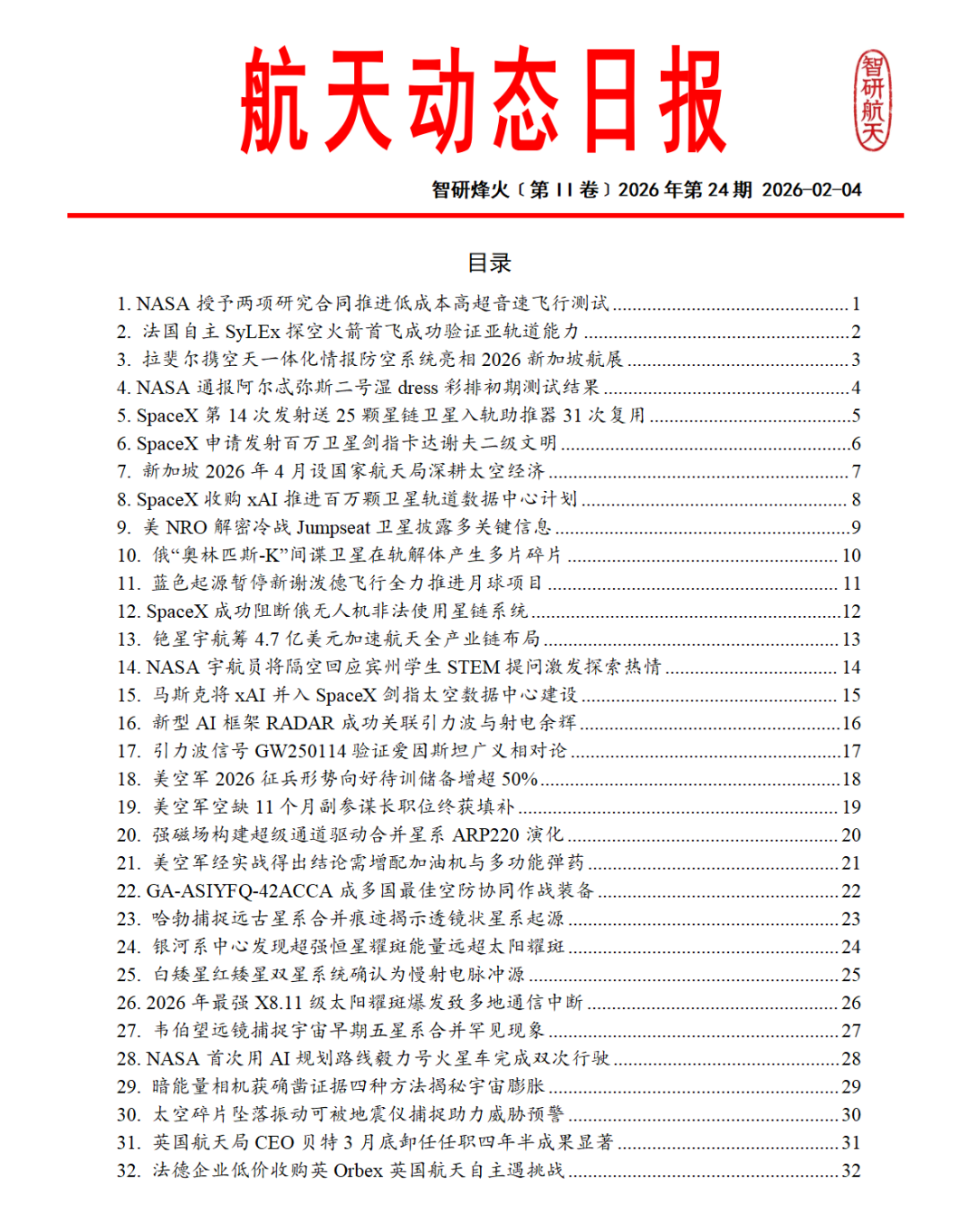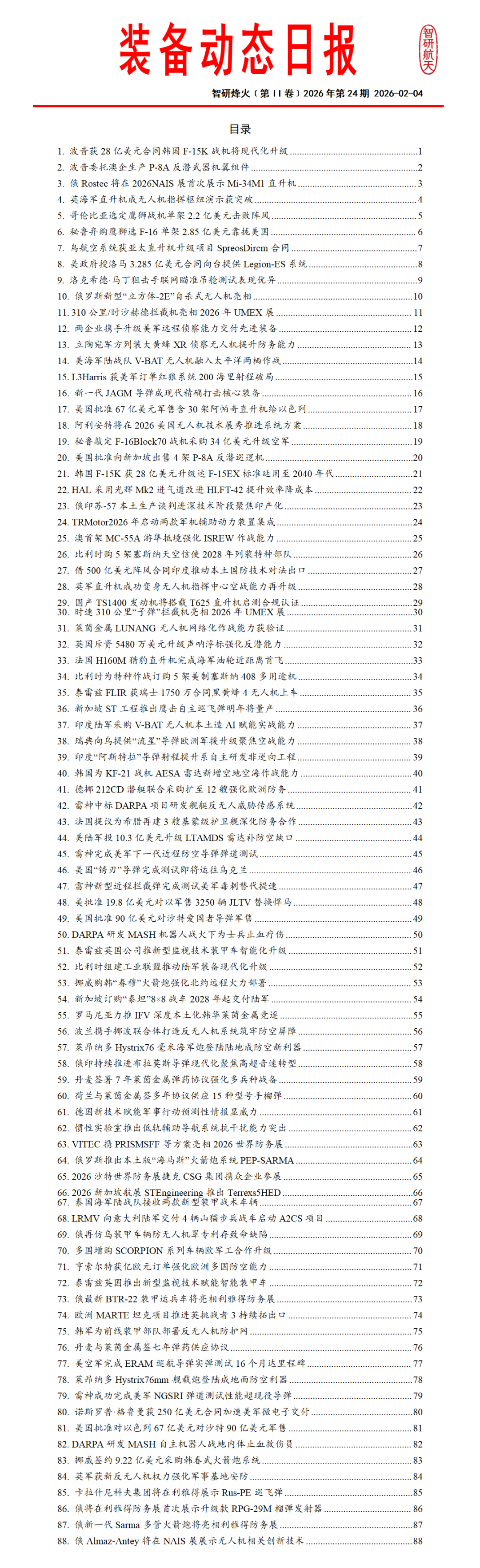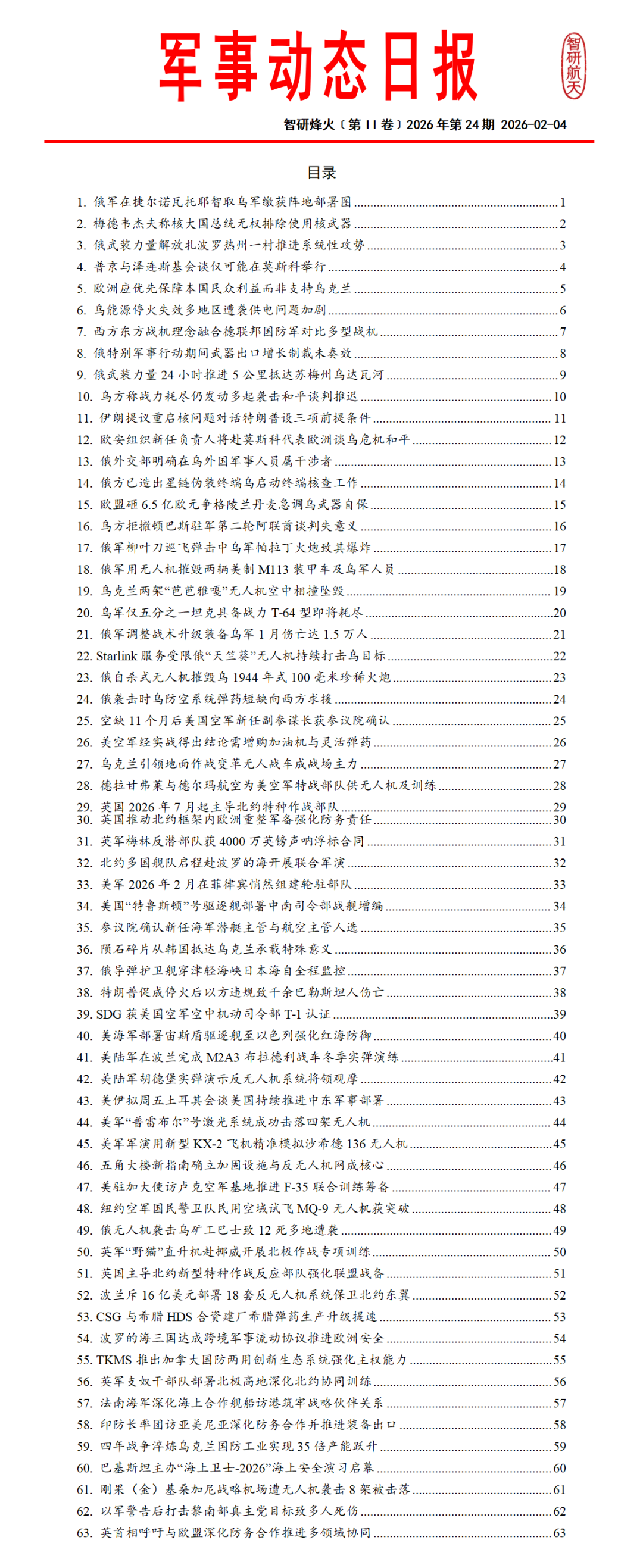 《全球防务动态》系列专刊国内独家每日发布涵盖航天领域、武器装备、军事热点、人工智能、先进制造等领域的全球动态信息。提供航天动态专报装备动态专报军事动态专报智造动态专报以及航天防务新闻日报等特色产品模块工作日每日推送,形成结构化、可编辑的文档,供订阅用户在小程序智研烽火信息商城下载。每日及时的动态信息能够有支持各单位进行报送、军情研究与安全形势分析的需求。