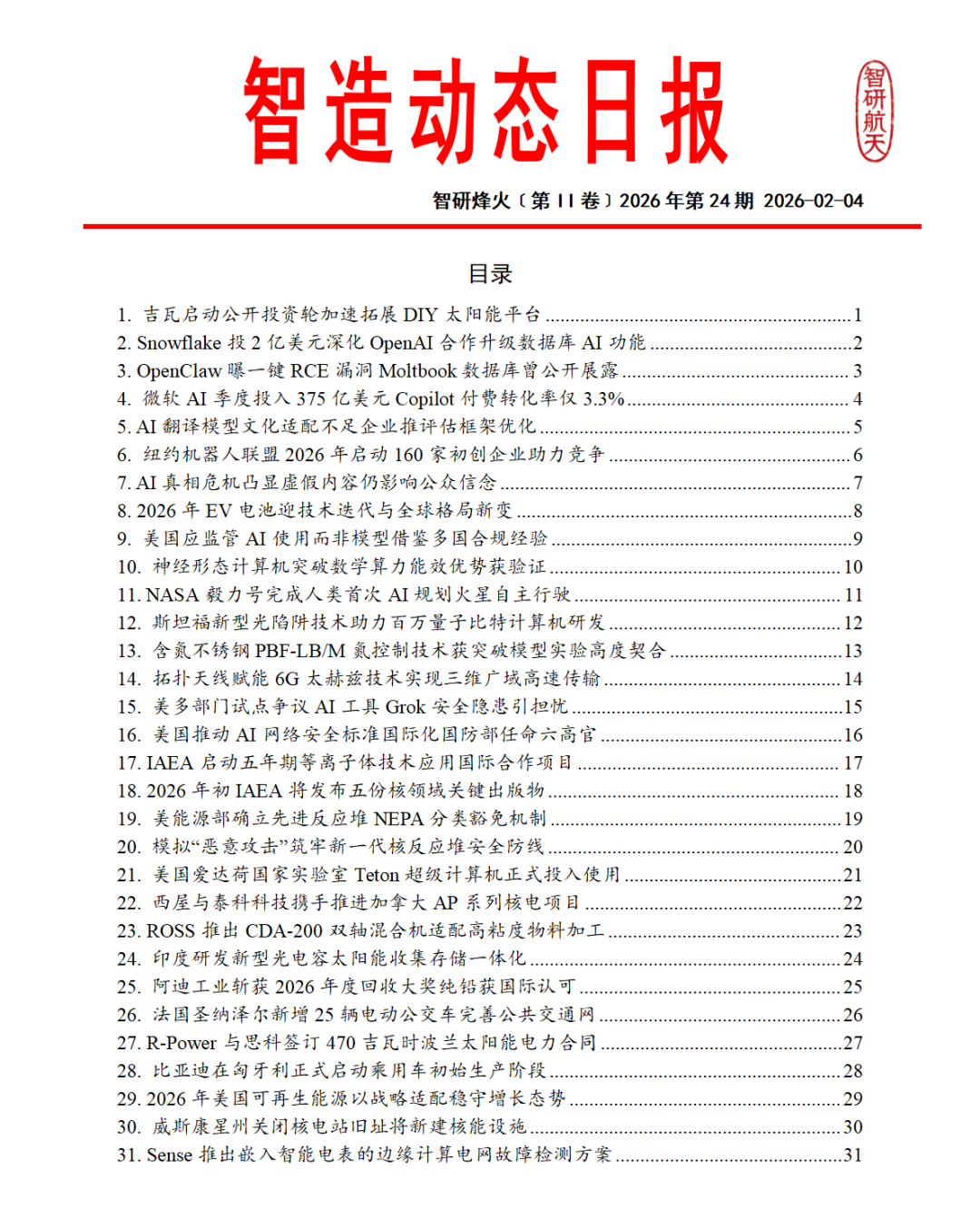 聚焦全球智能制造领域的权威情报产品,每日精选航空技术与应用人工智能、工业机器人、增材制造、芯片工艺等核心技术突破与产业动态,以结构化、可编辑的文档形式呈现。内容涵盖技术解析、企业战略及政策影响,依托资深专家团队及强大的开源情报处理能力,助力企业快速捕捉技术趋势与市场机遇,把握智造脉搏,引领产业升级。