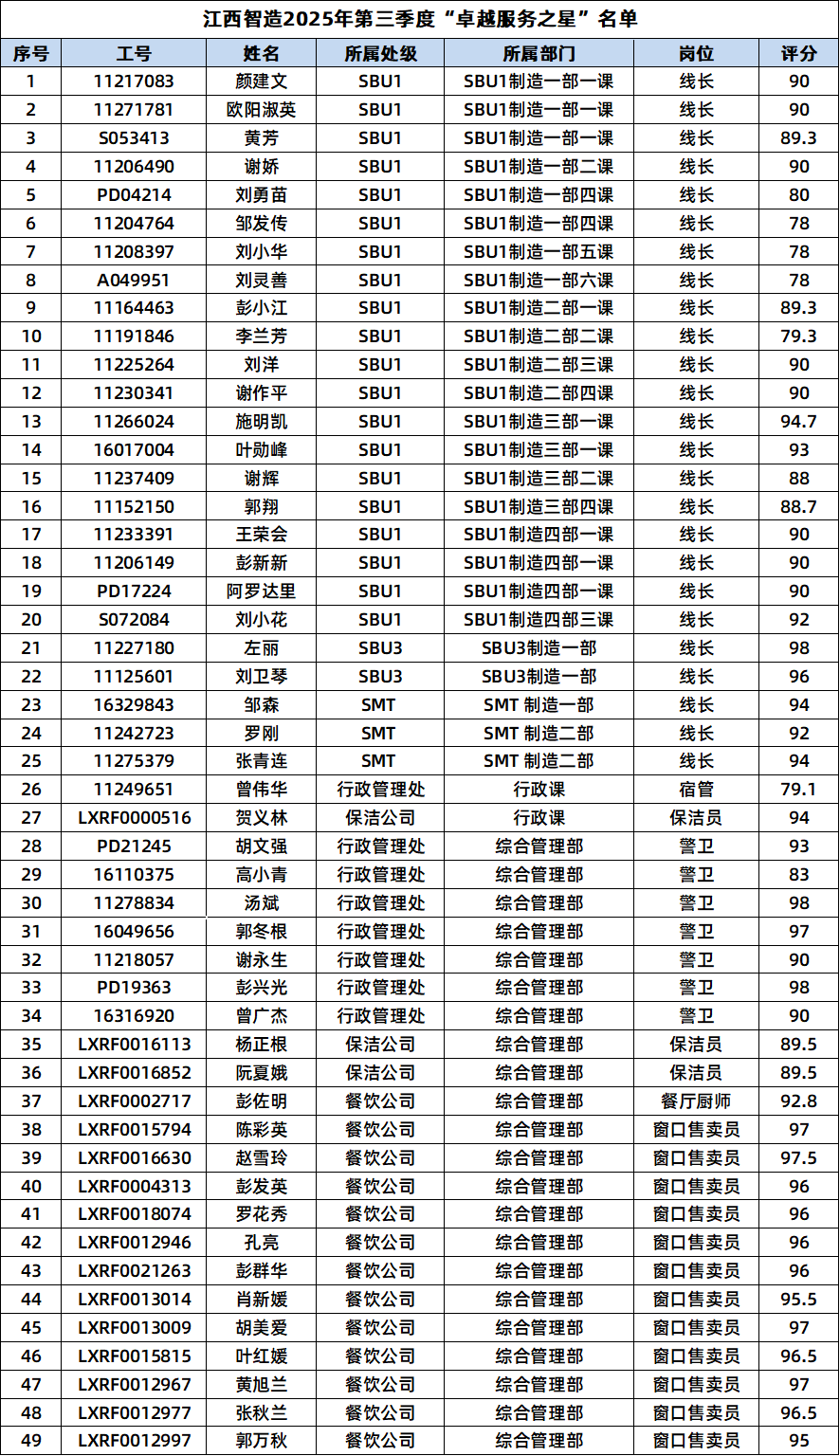 为了提升 DL 员工满意度,特对线长、警卫、保洁、宿管、餐厅窗口售卖员岗位人员开展“卓越服务之星”评选。2025年10月,各处有评选出49名卓越服务之星。