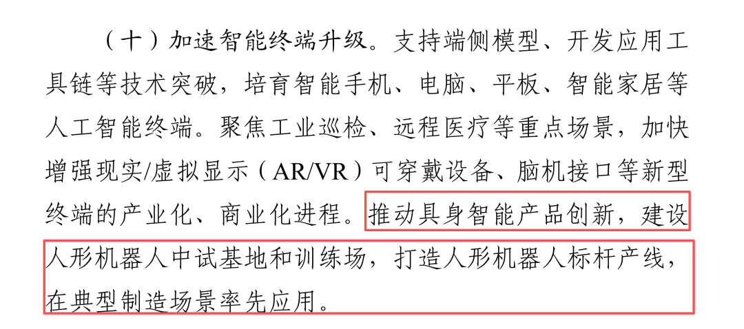 明确主攻方向:将“具身智能”与“人形机器人”提升至产品创新核心《实施意见》在“产品突破”部分,用前所未有的清晰表述,为行业划定了重点攻关领域。其核心是将机器人作为“构建智能新产品新业态”的关键一环。首先是要求加快人工智能赋能工业母机、工业机器人,研制新一代人工智能数控系统,提升自主决策、分析和执行等能力。这标志着工业机器人的发展重点将从传统的自动化执行向智能化决策与协同跃升。更具里程碑意义的则是,文件首次在国家级产业政策中,明确提出“推动具身智能产品创新”,并将建设人形机器人中试基地和训练场、打造标杆产线、在典型制造场景率先应用作为配套举措。一是通过中试基地解决从实验室样机到稳定产品的“工程化鸿沟”;二是通过标杆产线树立可量化的应用效益标杆,破解市场“不敢用”的难题;三是通过场景先行,为人形机器人的算法迭代和可靠性验证提供真实数据反馈,形成“应用-反馈-优化”的良性循环。这一国家层面的蓝图,在杭州市的《具身智能机器人“强链补链”行动方案》中得到了具体而迅速的响应。到2027年底,要打造3个以上量产人形机器人产品、5个以上量产仿生机器人产品,形成具有市场竞争力的产品矩阵。同时,杭州正着力打造国家级具身智能行业应用中试基地、人形机器人中试验证暨应用推广中心、具身智能机器人制造业创新中心等三大服务平台,并在多个区县布局虚拟与线下训练场,这正是一份精准落地国家战略的“施工图”。02