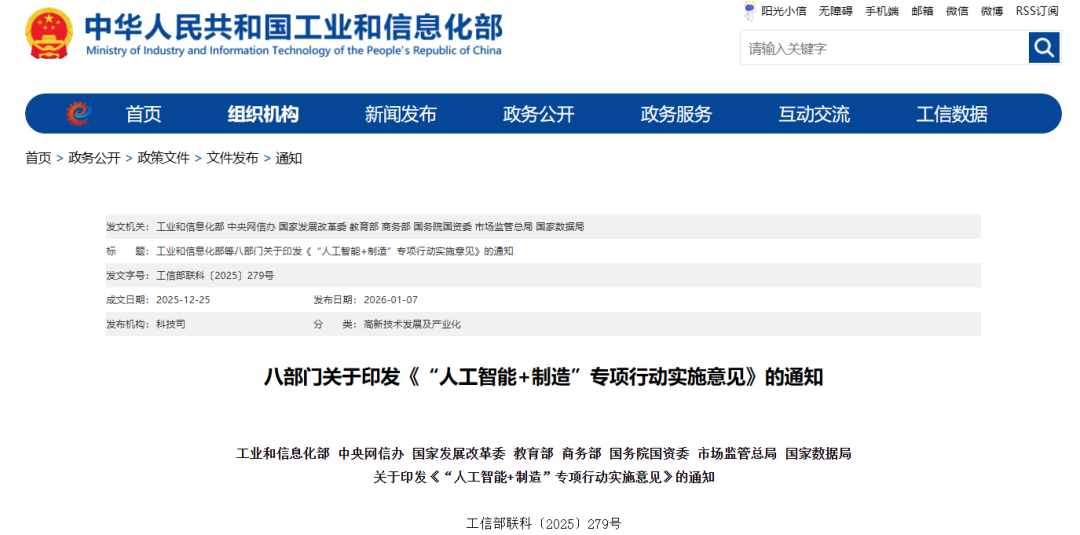 2026年开年,国家八部门联手为机器人行业送上“大礼包”!首提“推动具身智能产品创新”,明确要建人形机器人中试基地、训练场和标杆产线。这意味着什么?哪些领域将率先爆发?本文为你独家深度解读。机器人行业作为衡量国家科技创新和高端制造水平的重要标志,其战略地位日益凸显。随着全球新一轮科技革命和产业变革加速演进,以具身智能为代表的新一代机器人技术正成为重塑制造业竞争力的核心变量。2024年,具身智能首次被明确为人工智能重要前沿方向之一;而“十四五”规划与正在编制的“十五五”规划中,均将“机器人”、“人工智能与实体经济深度融合”列为关键任务,体现出国家层面对机器人产业发展的深远布局。近年来,总书记、总理等党和国家领导人多次考察机器人企业与研发机构,强调要“把机器人技术掌握在自己手中”,为行业发展注入强大信心与动力。就在昨天(1月7日),机器人领域再迎重磅政策利好!工业和信息化部、中央网信办、国家发展改革委、教育部、商务部、国务院国资委、市场监管总局、国家数据局等八部门联合印发了《“人工智能+制造”专项行动实施意见》。这份在2026年开年即发布的纲领性文件,系统部署了人工智能与制造业深度融合的路径,其中对机器人、具身智能及人形机器人给予了前所未有的明确指引,为2026年乃至未来数年机器人产业的发展奠定了“加速落地、重点突破”的鲜明基调。同时,地方层面(以杭州为例)已闻令而动,出台了极具针对性的配套方案,一场自上而下的产业落地行动已全面展开。01