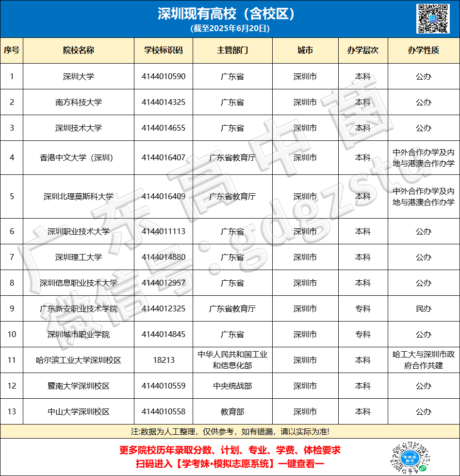 在深圳,有“双一流”高校——哈尔滨工业大学(深圳)、南科大合作办学高校——港中大(深圳)、深圳北理莫斯科;发展势头超猛的潜力新星——深圳大学、深圳技术大学;新晋本科高校的“前广东专科院校龙头老大”——深职大;还有年年超本科线专科院校——深信...