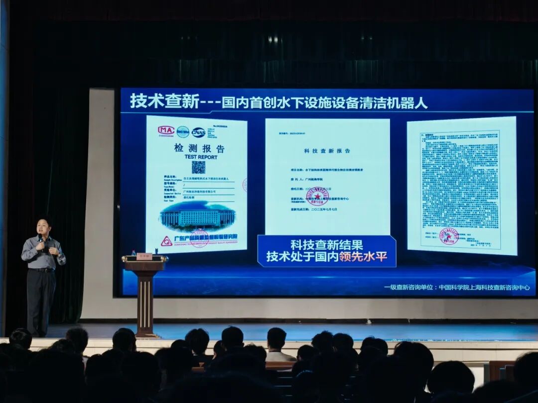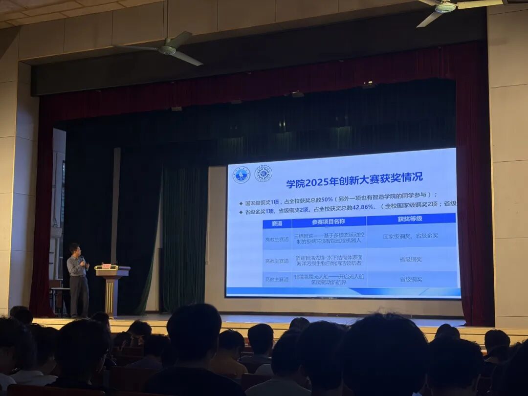 他首先简述了智能制造学院2025年大学生创新大赛的参赛和获奖情况:学院在2025年创新大赛取得了国家级铜奖1项、省级金奖1项、省级铜奖2项的亮眼成绩。随后,他详细解读了《广州航海学院“中国国际大学生创新大赛”参赛奖励管理办法(试行)》文件,从奖金激励、荣誉加持、学分与发展支持三大方面介绍了学校的丰厚参赛激励,以“荣誉-资源-发展”三位一体的创新生态,让同学们清晰知晓参赛的多重价值。他还结合学院科研成果,为同学们展示了特种焊接装备技术、智能物联车辆、水下设施智能运维作业机器人等优秀参赛项目案例,拆解优秀项目打造逻辑,强调创新要立足行业痛点、用专业技术解决实际问题,为新生提供实战参考,现场反响热烈。