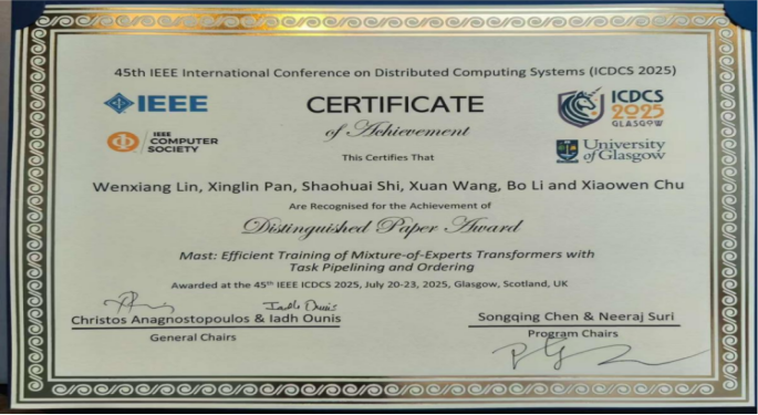 2025于7月20日至7月23日,第四十五届IEEE ICDCS在英国格拉斯哥召开。会议共收到投稿529篇,共有104篇论文入选,录用率为19.66%,最终评选出三篇杰出论文奖。哈尔滨工业大学(深圳)计算机应用研究中心施少怀教授课题组与香港科技大学(广州)褚晓文教授以及香港科技大学李波教授合作论文Mast: Efficient Training of Mixture-of-Experts Transformer with Task Pipelining and Ordering荣获IEEE ICDCS 2025杰出论文奖。