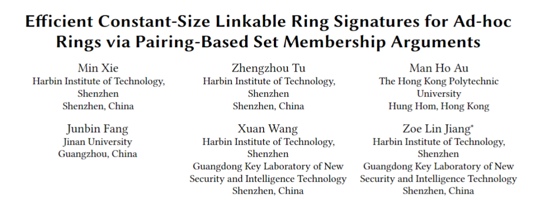 蒋琳教授课题组的博士生谢敏作为第一作者,其研究成果被信息安全顶级会议ACM CCS 2025接收。该研究由谢敏与硕士生涂正洲等合作完成,哈工大(深圳)为第一单位。论文提出了一种适用于大型临时环的高效固定大小可链接环签名新框架。通过创新的集合成员证明技术,将签名大小压缩至687字节,并在1024人规模下实现仅10.4毫秒的验证速度,性能提升最高达467倍。这一由课题组学生主导的突破,为大规模隐私保护应用提供了关键技术支撑。