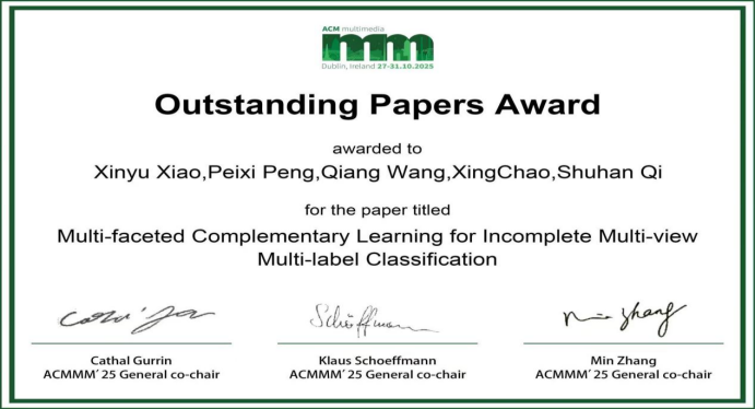 2025年10月27日至10月31日,ACM Multimedia在爱尔兰都柏林召开。本届会议于10月27日至10月31日在英国格拉斯哥召开,会议共收到投稿4711篇,共有1251篇论文被接收,录用率为26.6%,最终评选出12篇杰出论文奖。哈尔滨工业大学(深圳)计算机应用研究中心漆舒汉课题组博士生肖鑫宇所完成的论文Multi-faceted Complementary Learning for Incomplete Multi-view Multi-label Classification荣获ACM Multimedia 2025杰出论文奖。