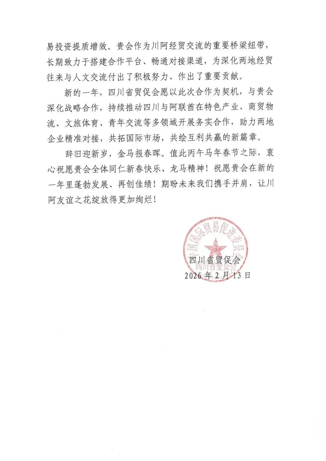 新的一年,四川省贸促会愿以此次合作为契机,与贵会深化战略合作,持续推动四川与阿联酋在特色产业、商贸物流、文旅体育、青年交流等多领域开展务实合作,助力两地企业精准对接,共拓国际市场,共绘互利共赢的新篇章。